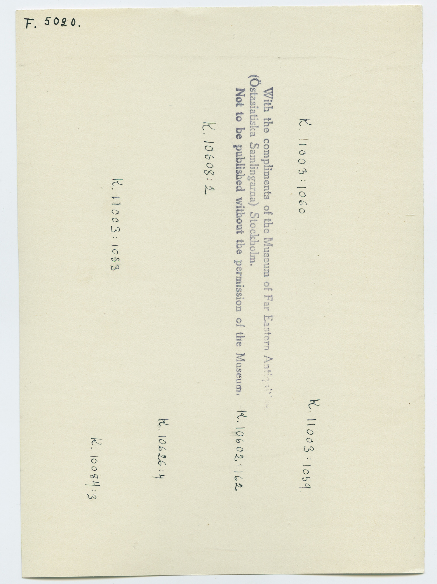 • Påsikt i Osvald Siréns arkivmaterial, 109590-109763 ("blå box 22"). Vissa bilder enbart urklipp av föremålsbild med flera föremål.