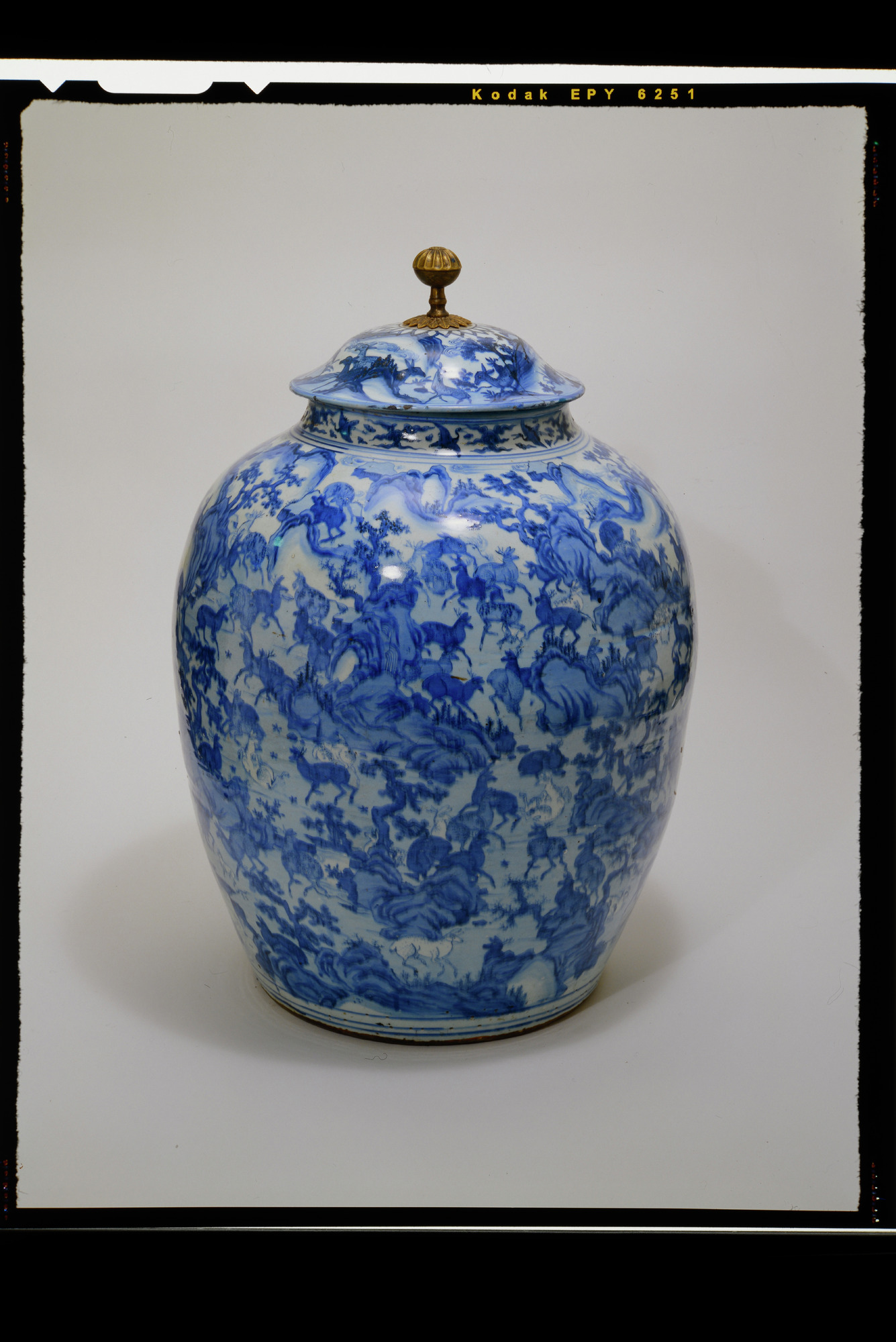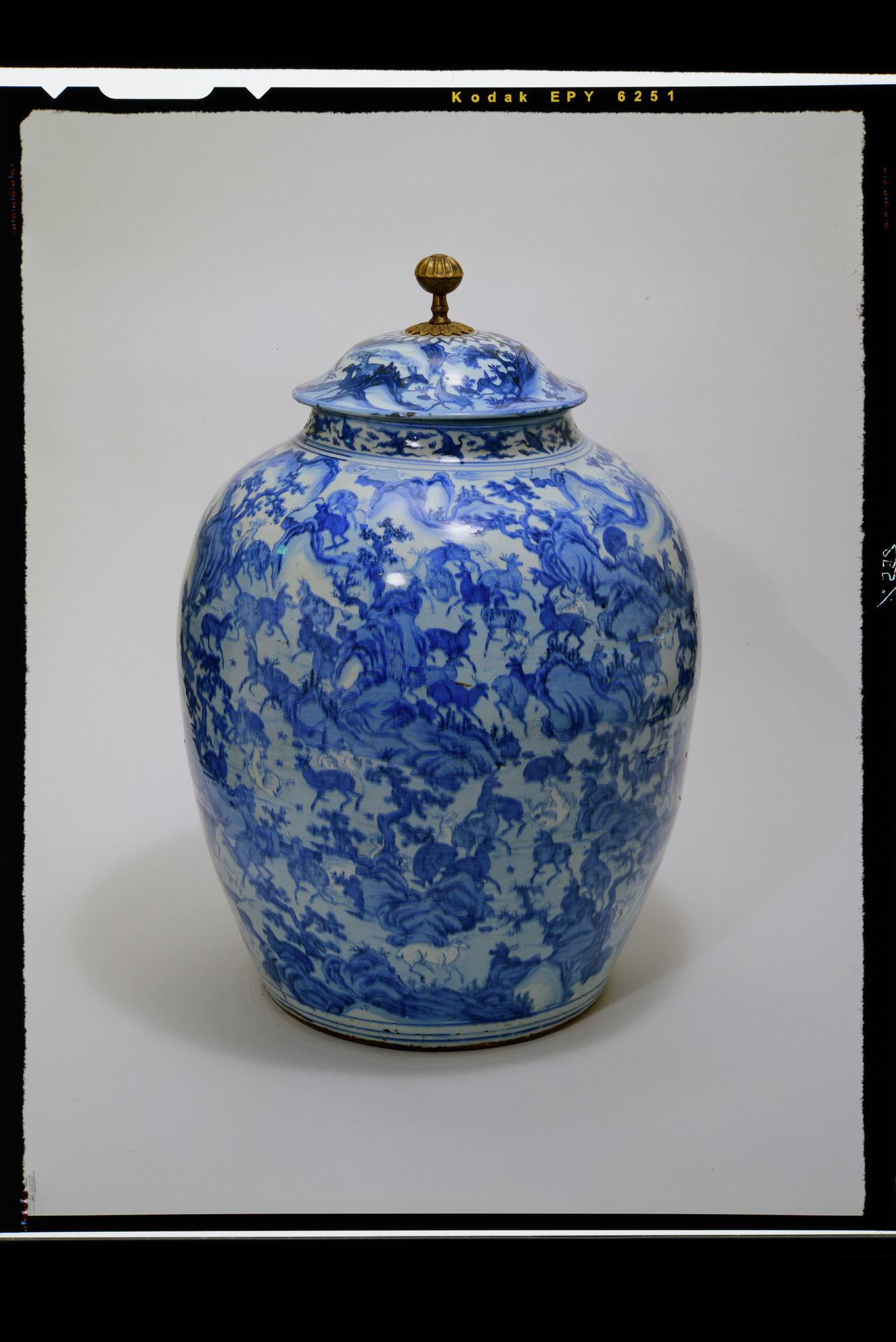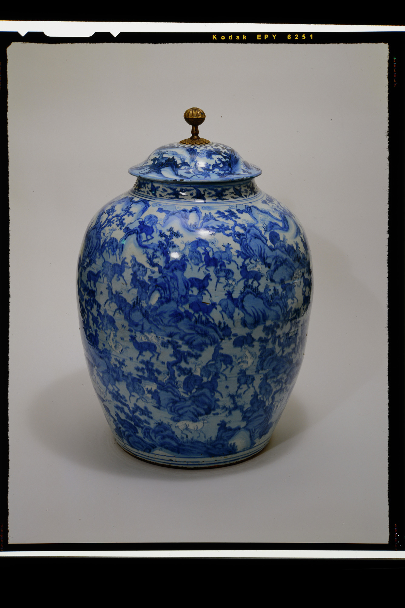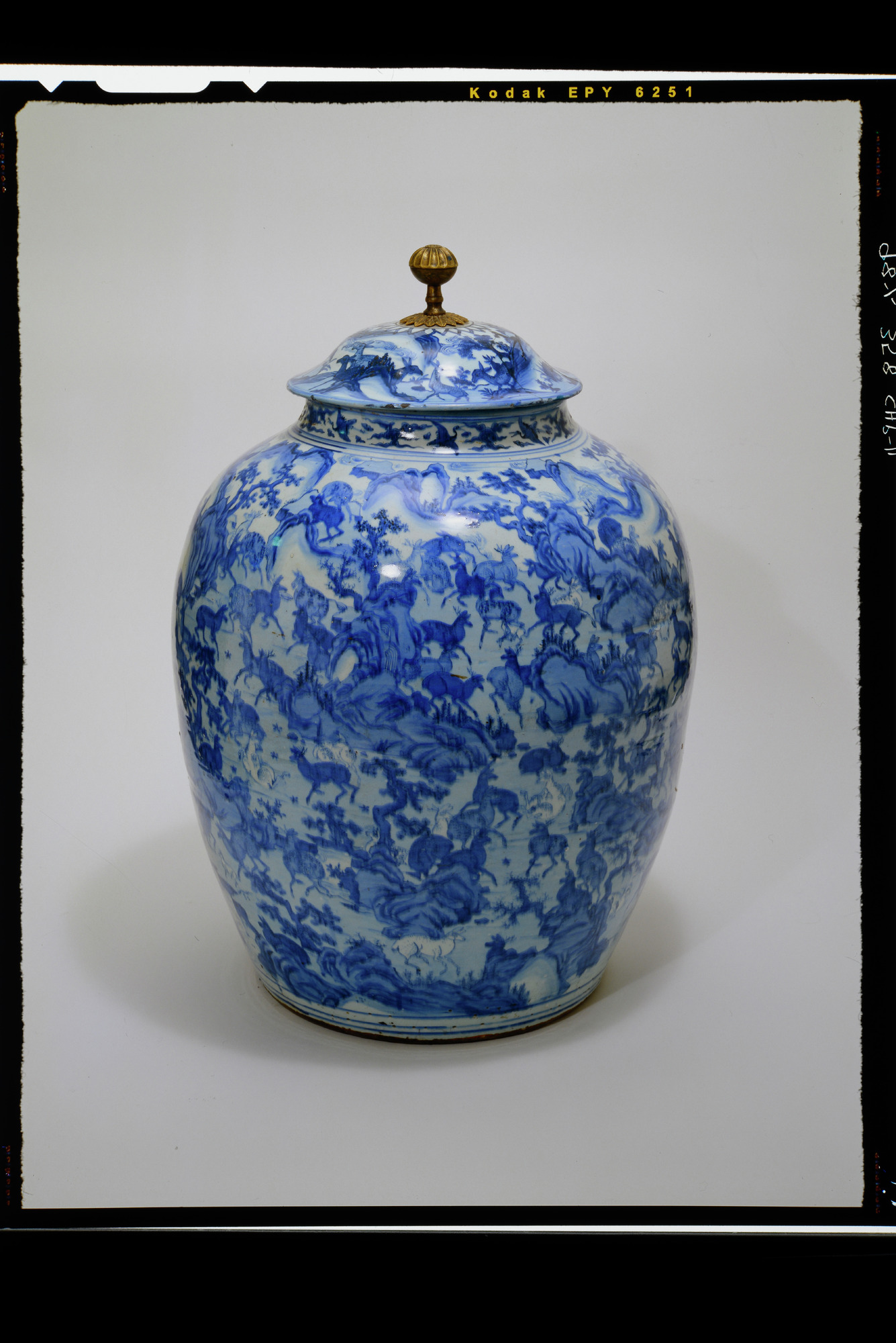 Text på plastficka: Foto -97 ERIK CORNELIUS ÖSTASIATISKA MUSEET. CXV 1586 Large urn(one of a pair). Ming, Wanli.. Text på huvudkuvert: CXV 1586. Färg. Ming, Wanli. "Drottning Kristinas urnor". Nytagning av E.C. nov -97. 4 ex. 2 ex (större knopp). Sep 2001 Utlån Gulbenkian Museum, Lissabon, för katalog.
