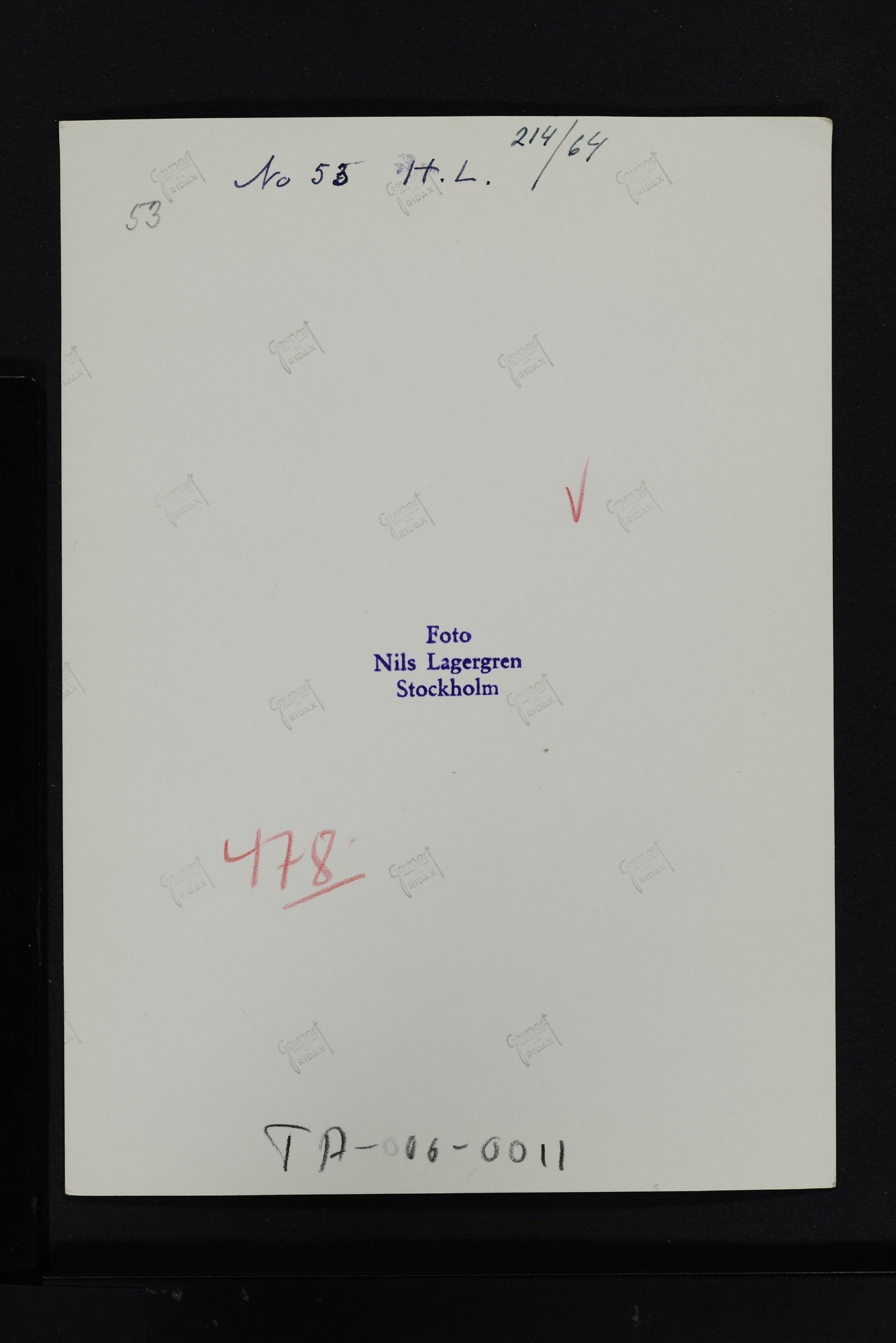 • Text, påsikt: 53 No 53 H.L. 214/64 Foto Nils Lagergren Stockholm 478. Text på huvudkuvert: O.M. 214/64.
