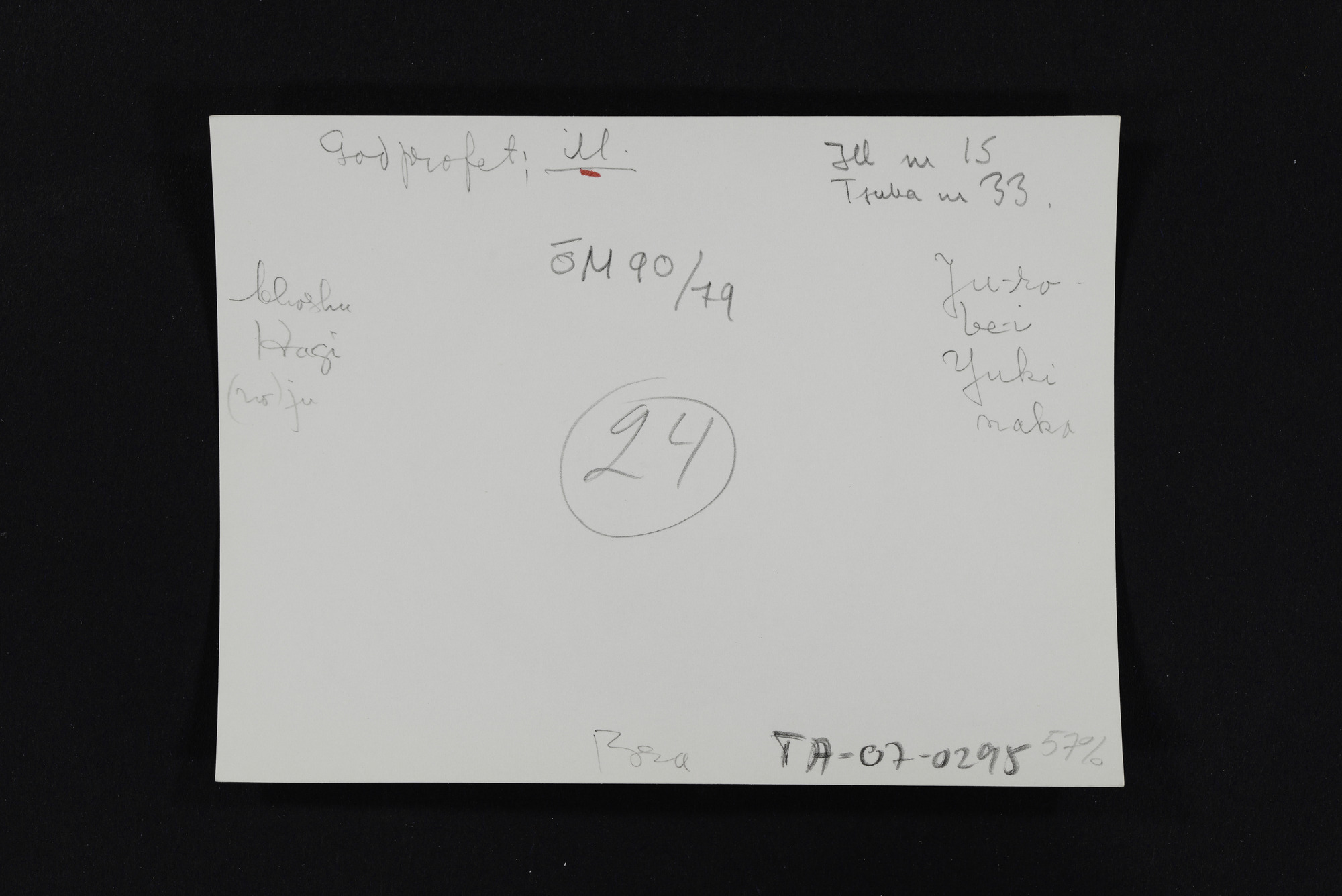 • Text, påsikt: OM 90/79 Godprofet; ill. Ill nr 15 Tsuba 33. bhoshu Kagi (no) ju Ju-ro be-i Yuki naka 24 Bra 57%. Text på huvudkuvert: OM 90/79.