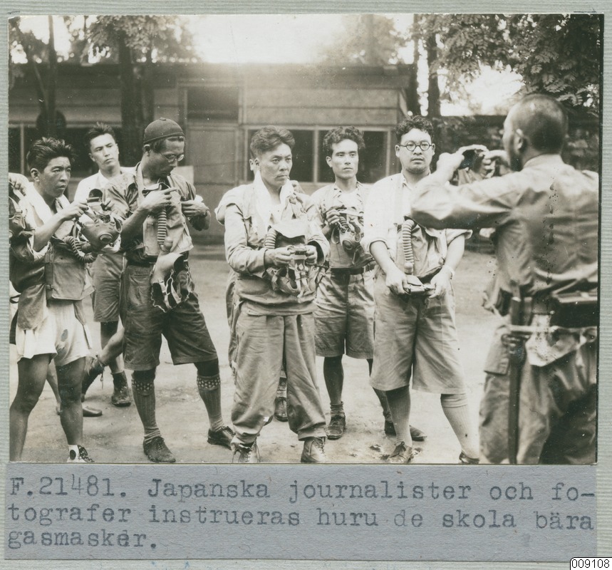 • Japanska journalister och fotografer instrueras huru de skola bära gasmasker.