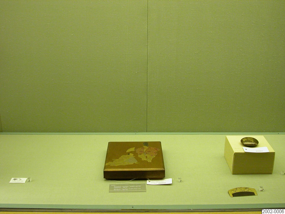 • Dokumentation av utställning. Monter, Japansalen, Östasiatiska museet, 2002. Föremålen har försetts med etiketter inför nedpackningen.