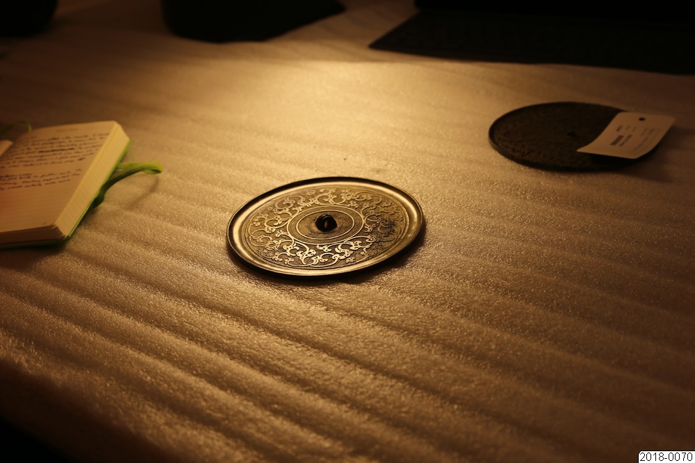 • Dokumentation av spegel, OM-1974-0190 i samband med forskarbesök på Östasiatiska museet.