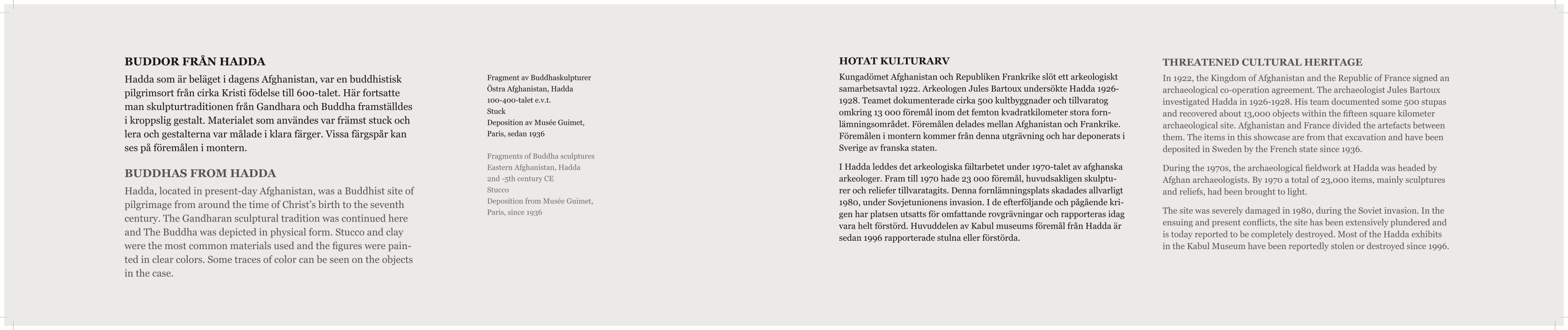 BUDDOR FRÅN HADDA Hadda som är beläget i dagens Afghanistan, var en buddhistisk pilgrimsort från cirka Kristi födelse till 600-talet. Här fortsatte man skulpturtraditionen från Gandhara och Buddha framställdes i kroppslig gestalt. Materialet som användes var främst stuck och lera och gestalterna var målade i klara färger. Vissa färgspår kan ses på föremålen i montern. BUDDHAS FROM HADDA Hadda, located in present-day Afghanistan, was a Buddhist site of pilgrimage from around the time of Christ’s birth to the seventh century. The Gandharan sculptural tradition was continued here and The Buddha was depicted in physical form. Stucco and clay were the most common materials used and the figures were pain- ted in clear colors. Some traces of color can be seen on the objects in the case. Fragment av Buddhaskulpturer Östra Afghanistan, Hadda 100-400-talet e.v.t. Stuck Deposition av Musée Guimet, Paris, sedan 1936 Fragments of Buddha sculptures Eastern Afghanistan, Hadda 2nd -5th century CE Stucco Deposition from Musée Guimet, Paris, since 1936 HOTAT KULTURARV Kungadömet Afghanistan och Republiken Frankrike slöt ett arkeologiskt samarbetsavtal 1922. Arkeologen Jules Bartoux undersökte Hadda 1926- 1928. Teamet dokumenterade cirka 500 kultbyggnader och tillvaratog omkring 13 000 föremål inom det femton kvadratkilometer stora forn- lämningsområdet. Föremålen delades mellan Afghanistan och Frankrike. Föremålen i montern kommer från denna utgrävning och har deponerats i Sverige av franska staten. I Hadda leddes det arkeologiska fältarbetet under 1970-talet av afghanska arkeologer. Fram till 1970 hade 23 000 föremål, huvudsakligen skulptu- rer och reliefer tillvaratagits. Denna fornlämningsplats skadades allvarligt 1980, under Sovjetunionens invasion. I de efterföljande och pågående kri- gen har platsen utsatts för omfattande rovgrävningar och rapporteras idag vara helt förstörd. Huvuddelen av Kabul museums föremål från Hadda är sedan 1996 rapporterade stulna eller förstörda. THREATENED CULTURAL HERITAGE In 1922, the Kingdom of Afghanistan and the Republic of France signed an archaeological co-operation agreement. The archaeologist Jules Bartoux investigated Hadda in 1926-1928. His team documented some 500 stupas and recovered about 13,000 objects within the fifteen square kilometer archaeological site. Afghanistan and France divided the artefacts between them. The items in this showcase are from that excavation and have been deposited in Sweden by the French state since 1936. During the 1970s, the archaeological fieldwork at Hadda was headed by Afghan archaeologists. By 1970 a total of 23,000 items, mainly sculptures and reliefs, had been brought to light. The site was severely damaged in 1980, during the Soviet invasion. In the ensuing and present conflicts, the site has been extensively plundered and is today reported to be completely destroyed. Most of the Hadda exhibits in the Kabul Museum have been reportedly stolen or destroyed since 1996. 1. Den historiska Buddha. Det här är en tidig gestaltning av Buddha i mänsklig form. Den hellenistisk-buddhistiska konststilen var populär i Gandhara. Därför är han klädd i en grekisk toga. Buddha Shakyamuni Pakistan 200-talet e.v.t. Sandsten NMOK-511 1. The Historical Buddha. This is an early depiction of The Buddha in human form. Due to the Indo-Greek style of art that was popular in Gandhara, his robes are in the style of a Greek toga. Buddha Shakyamuni Pakistan 3rd century CE Sandstone NMOK-511 2. The Historical Buddha. A nearly nude figure that holds a club appears beside The Buddha in both scenes of this panel. This is Vajrapani, a protector deity of The Buddha. However, sculptors of Gandhara used the icono- graphy of the Greek god Hercules to depict Vajrapani. Buddha Shakyamuni with Disciples Pakistan 3rd century CE Stone HM-2176 3. Donors Burning Incense. This base of a Buddha figure depicts donors that contributed to the making of this image. They are burning incense as an offering to The Buddha. The top part would have been similar to the Buddha sculpture in this case (1). Plinth to statue of Buddha Pakistan 3rd century CE Stone OS-120 4. Buddha in Meditation. The scene in this sculpture depicts The Buddha meditating under the Bodhi Tree, under which he became enlightened. This is the base of a larger sculpture that supported a standing Buddha on top. Plinth to statue of Buddha Pakistan 3rd century CE Sten 5. The Historical Buddha Entering Nirvana. This image depicts the death of The Buddha, at which time he attained Nirvana – the state in which suffering and the cycle of rebirth stops. His mourning followers surround him. Relief Pakistan 3rd century CE Stone OM-1973-0021 2. Den historiska Buddha. En nästan naken figur med en påk i handen står bredvid Buddha i båda scenerna på den här reliefen. Det är Vajrapani, en gudom som skyddar Buddha. Skulptörerna i Gandhara inspirerades av den grekiska guden Herkules i gestaltningen av Vajrapani. Buddha Shakyamuni med lärjungar Pakistan 200-tal e.v.t. Sten HM-2176 3. Donatorer bränner rökelse. På den här sockeln till en buddhafigur ser vi donatorerna som bekostat skulpturen. De bränner rökelse till Buddhas ära. Bildens övre del har troligen liknat buddhaskulpturen i montern (nr 1). Sockel till buddhastaty Pakistan 200-tal e.v.t. Sten OS-120 4. Buddha i meditationsställning. Skulpturen före- ställer Buddha som mediterar under bodhiträdet där han blev upplyst. Det här är sockeln till en större skulptur med en stående Buddha överst. Sockel till buddhastaty Pakistan 200-tal e.v.t. Sten 5. Den historiska Buddhas inträdande i nirvana. Här är det Buddhas död som skildras. Han uppgår i nirvana – det tillstånd där lidande och återfödelse upphör. Han är omgiven av sörjande troende. Relief Pakistan 200-tal e.v.t. Sten OM-1973-0021