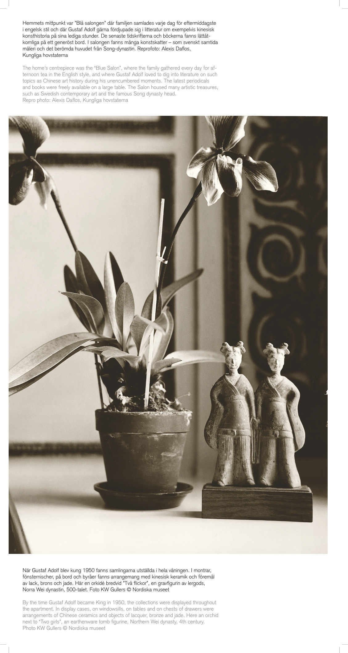 Hemmets mittpunkt var ”Blå salongen” där familjen samlades varje dag för eftermiddagste i engelsk stil och där Gustaf Adolf gärna fördjupade sig i litteratur om exempelvis kinesisk konsthistoria på sina lediga stunder. De senaste tidskrifterna och böckerna fanns lättåt- komliga på ett generöst bord. I salongen fanns många konstskatter – som svenskt samtida måleri och det berömda huvudet från Song-dynastin. Reprofoto: Alexis Daflos, Kungliga hovstaterna The home’s centrepiece was the “Blue Salon”, where the family gathered every day for af- ternoon tea in the English style, and where Gustaf Adolf loved to dig into literature on such topics as Chinese art history during his unencumbered moments. The latest periodicals and books were freely available on a large table. The Salon housed many artistic treasures, such as Swedish contemporary art and the famous Song dynasty head. Repro photo: Alexis Daflos, Kungliga hovstaterna När Gustaf Adolf blev kung 1950 fanns samlingarna utställda i hela våningen. I montrar, fönsternischer, på bord och byråer fanns arrangemang med kinesisk keramik och föremål av lack, brons och jade. Här en orkidé bredvid ”Två flickor”, en gravfigurin av lergods, Norra Wei dynastin, 500-talet. Foto KW Gullers © Nordiska museet By the time Gustaf Adolf became King in 1950, the collections were displayed throughout the apartment. In display cases, on windowsills, on tables and on chests of drawers were arrangements of Chinese ceramics and objects of lacquer, bronze and jade. Here an orchid next to “Two girls”, an earthenware tomb figurine, Northern Wei dynasty, 4th century. Photo KW Gullers © Nordiska museet