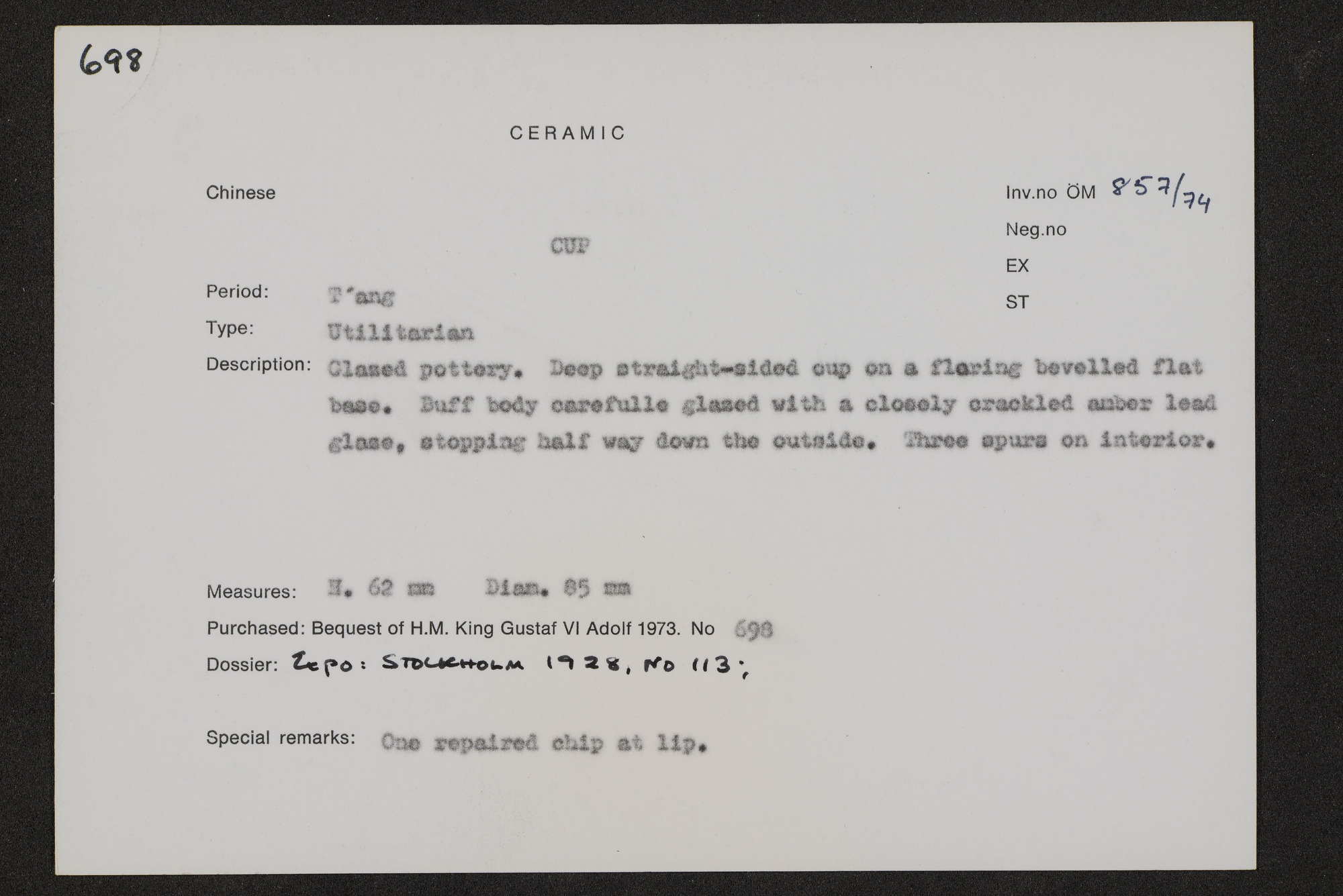 • Katalogkort ur Östasiatiska museets arkiv som beskriver föremål ur samlingarna.