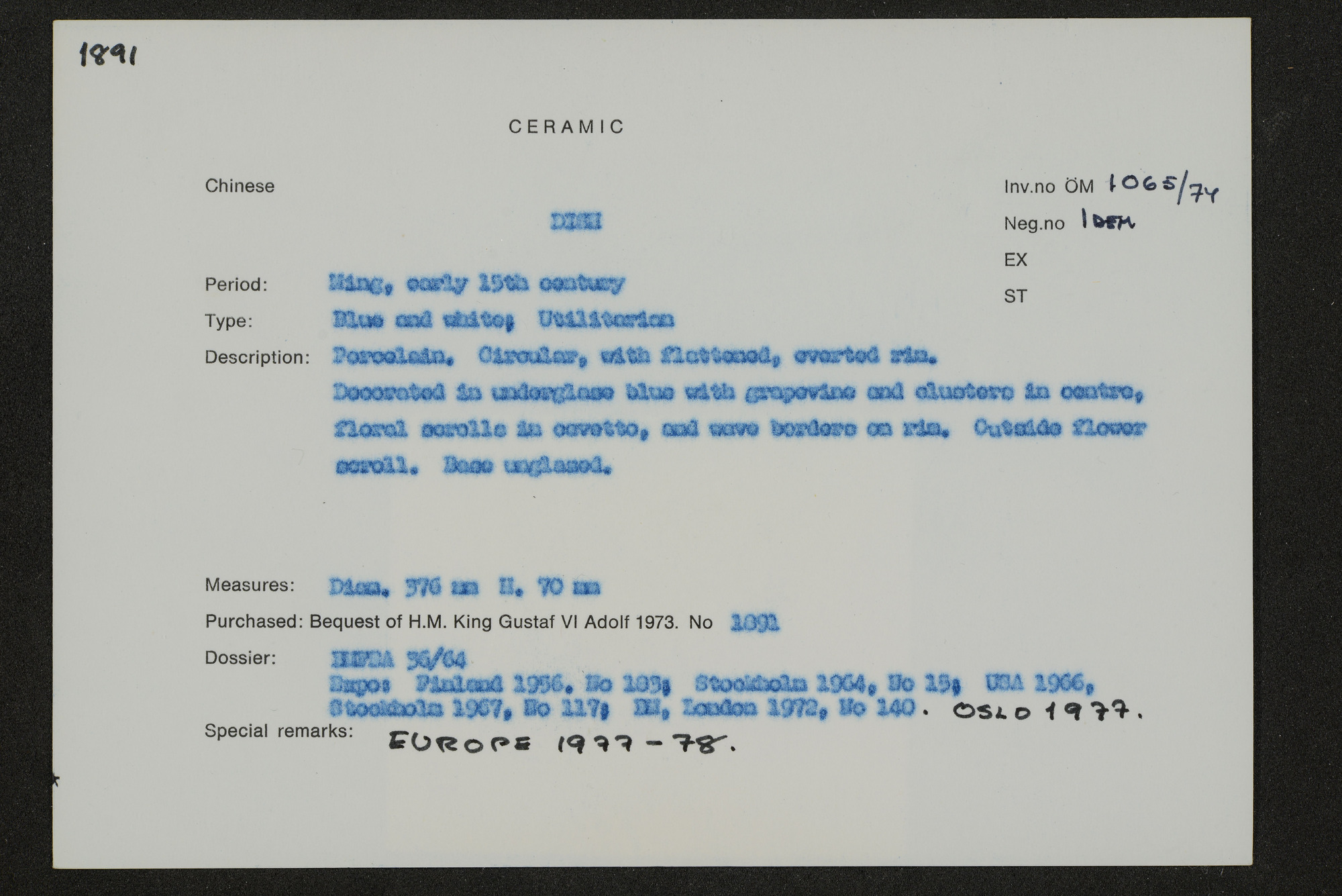 • Katalogkort ur Östasiatiska museets arkiv som beskriver föremål ur samlingarna.