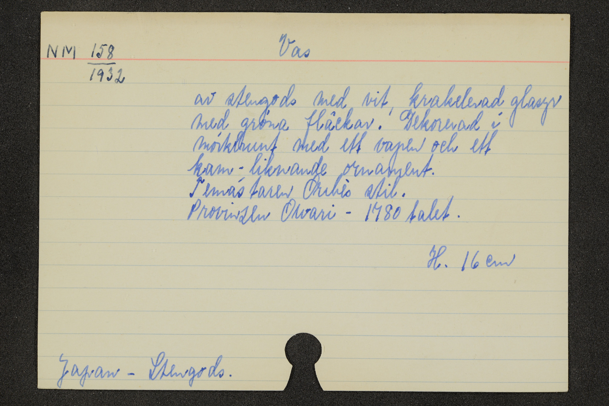 • Katalogkort ur Östasiatiska museets arkiv som beskriver föremål ur samlingarna.