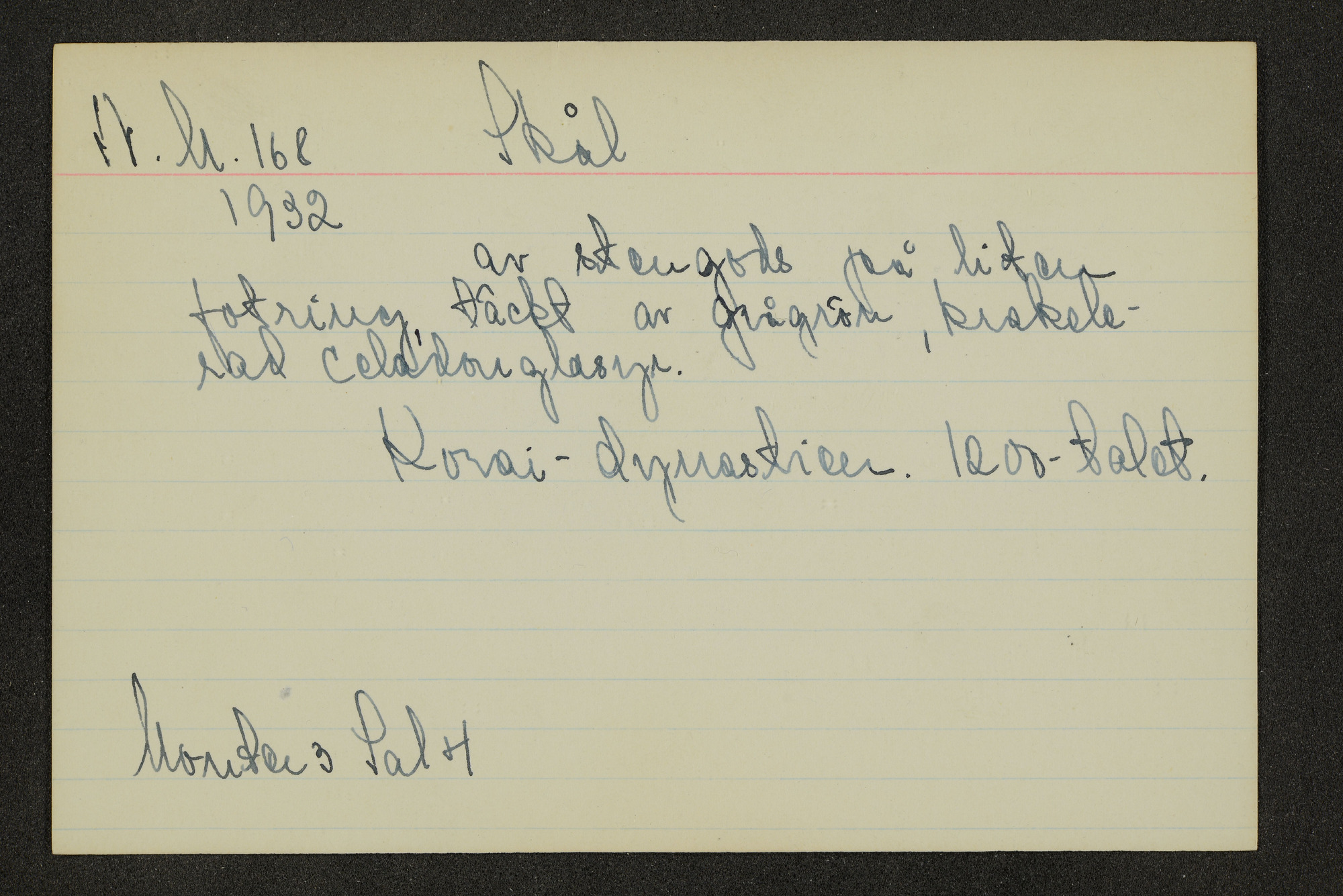 • Katalogkort ur Östasiatiska museets arkiv som beskriver föremål ur samlingarna.