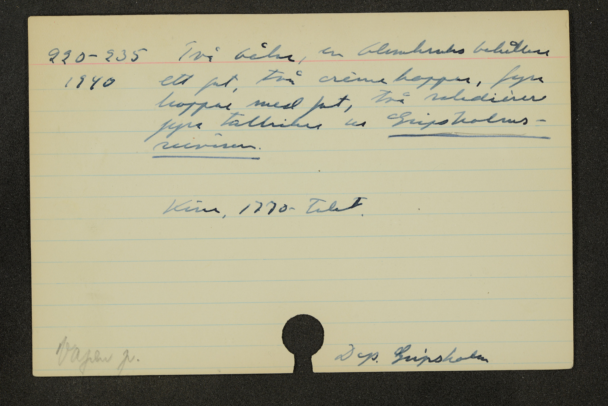 • Katalogkort ur Östasiatiska museets arkiv som beskriver föremål ur samlingarna.
