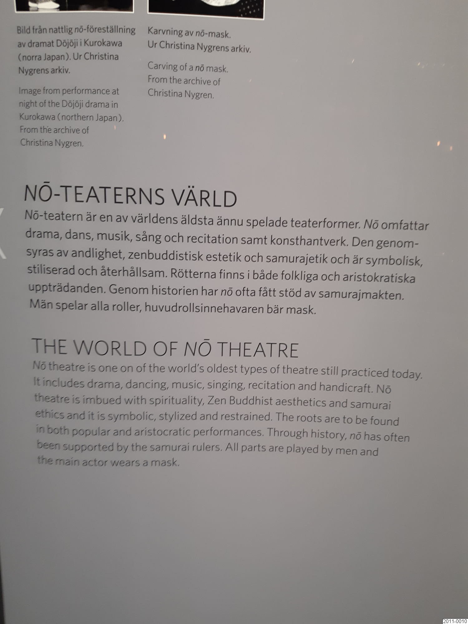 No theatre is one on of the world's oldest types of theatre still practised today. It includes drama, dancing, music, singing recitation and handicraft. No theatre is imbued with spirituality, Zen Buddhist aesthetics and samurai ethics and it is symbolic, stylized and restrained. The roots are to be found in both popular and aristocratic performances. Through history, no has often been supported by the samurai rulers. All parts are played by men and the main actor wears a mask.
