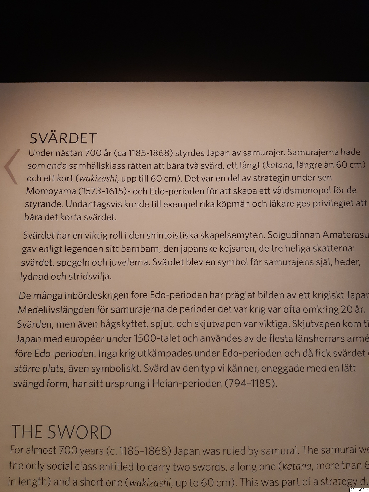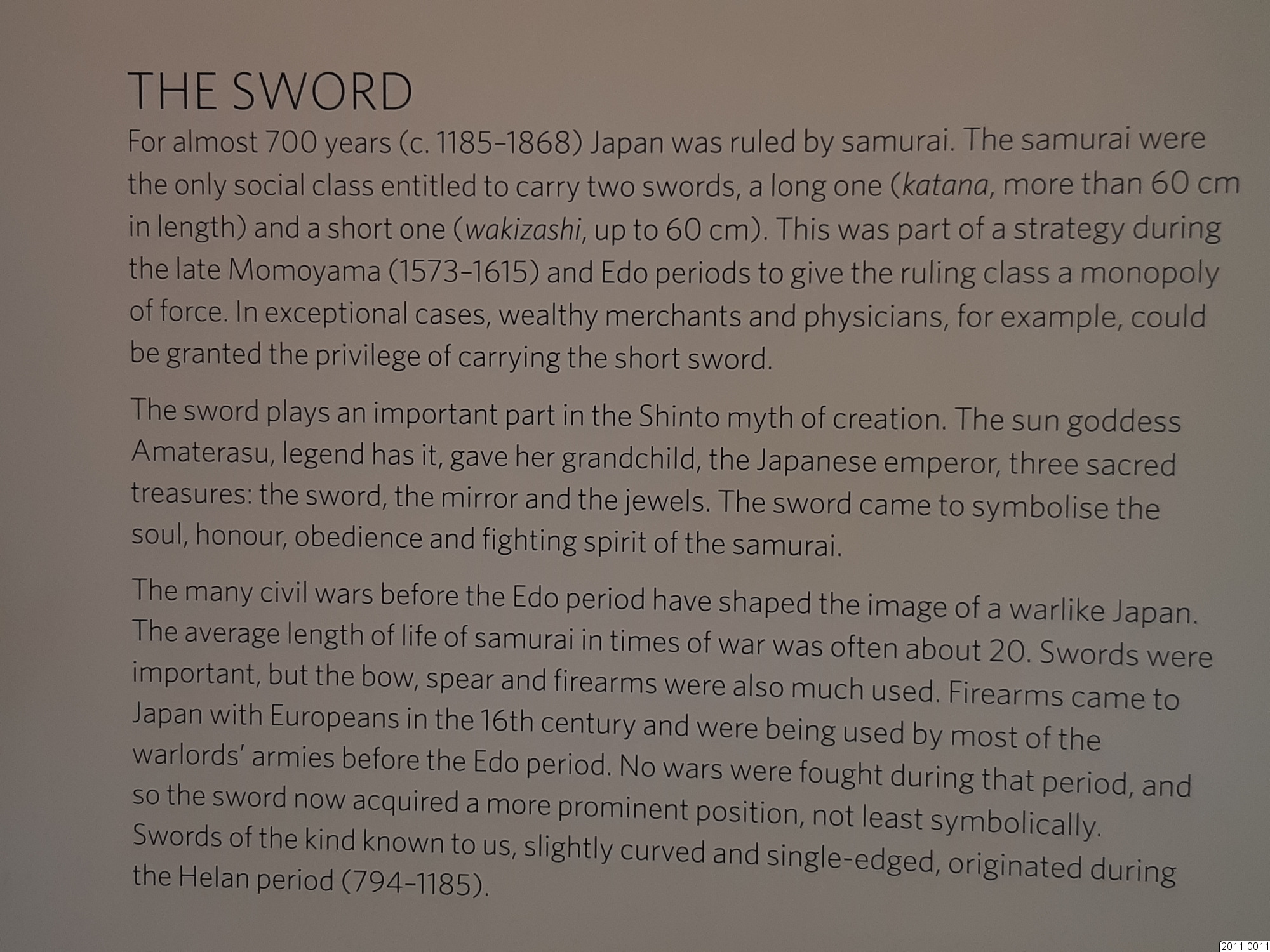 THE SWORD For almost 700 years (c. 1185–1868) Japan was ruled by samurai. The samurai were the only social class entitled to carry two swords, a long one (katana, more than 60 cm in length) and a short one (wakizashi, up to 60 cm). This was part of a strategy during the late Momoyama (1573–1615) and Edo periods to give the ruling class a monopoly of force. In exceptional cases, wealthy merchants and physicians, for example, could be granted the privilege of carrying the short sword.