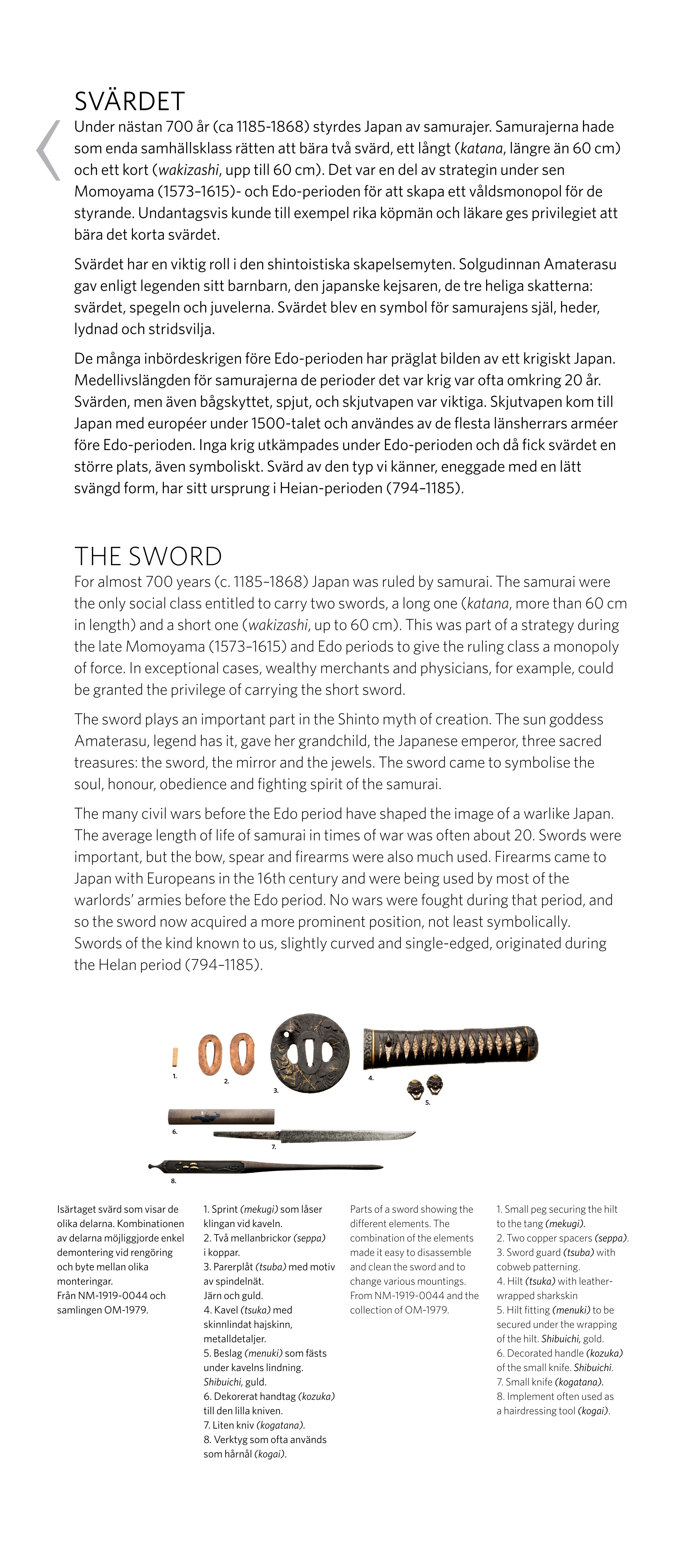 Parts of a sword showing the different elements. The combination of the elements made it easy to disassemble and clean the sword and to change various mountings. From NM-1919-0044 and the collection of OM-1979. 1. Small peg securing the hilt to the tang (mekugi). 2. Two copper spacers (seppa). 3. Sword guard (tsuba) with cobweb patterning. 4. Hilt (tsuka) with leather- wrapped sharkskin 5. Hilt fitting (menuki) to be secured under the wrapping of the hilt. Shibuichi, gold. 6. Decorated handle (kozuka) of the small knife. Shibuichi. 7. Small knife (kogatana). 8. Implement often used as a hairdressing tool (kogai).
