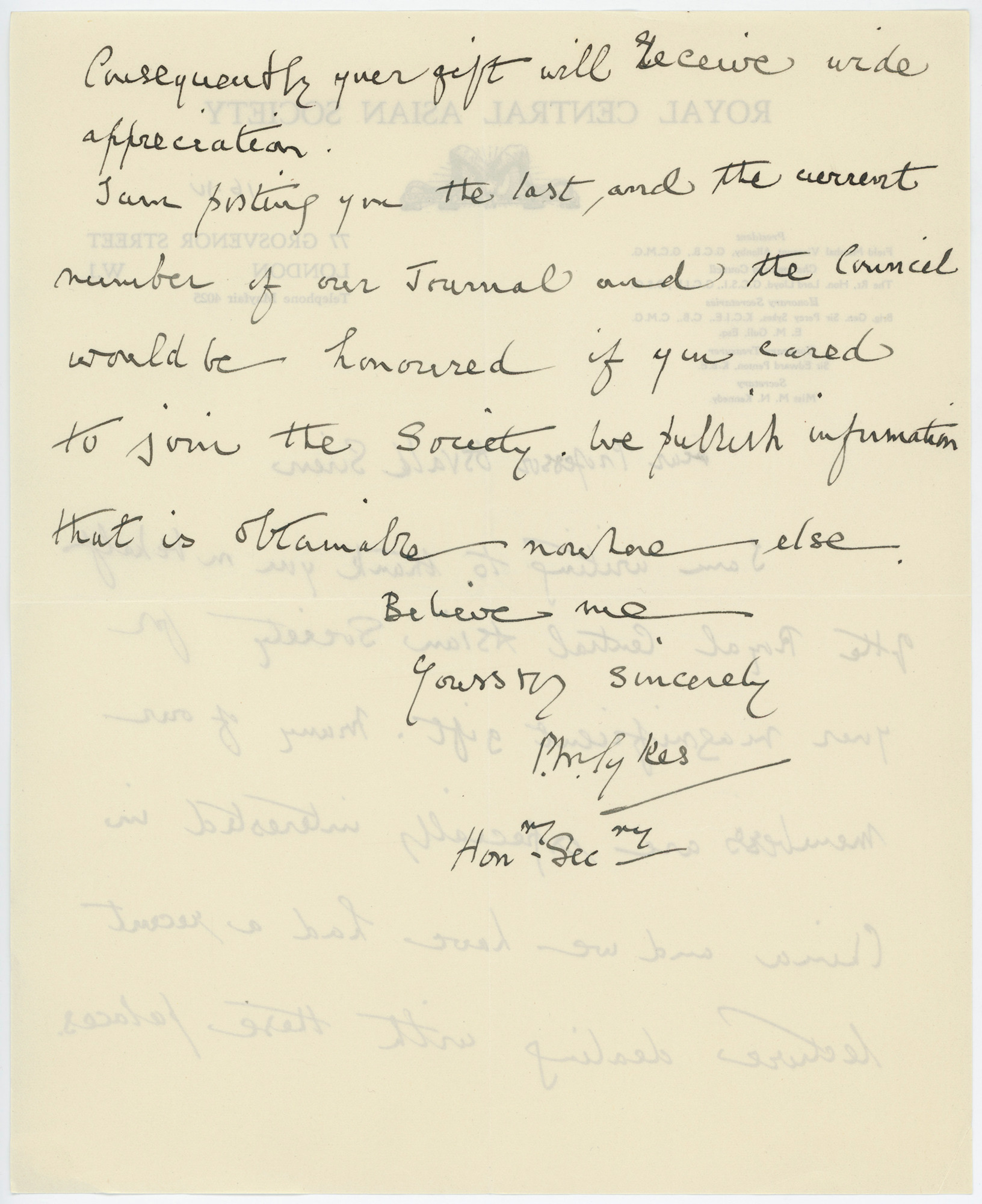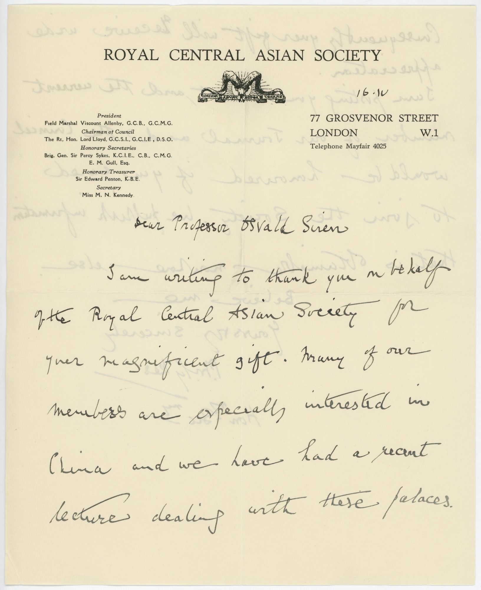• Ett handskrivet brev på engelska till Sirén från Royal Central Asian Society, daterat 16/4, 1930-1945.