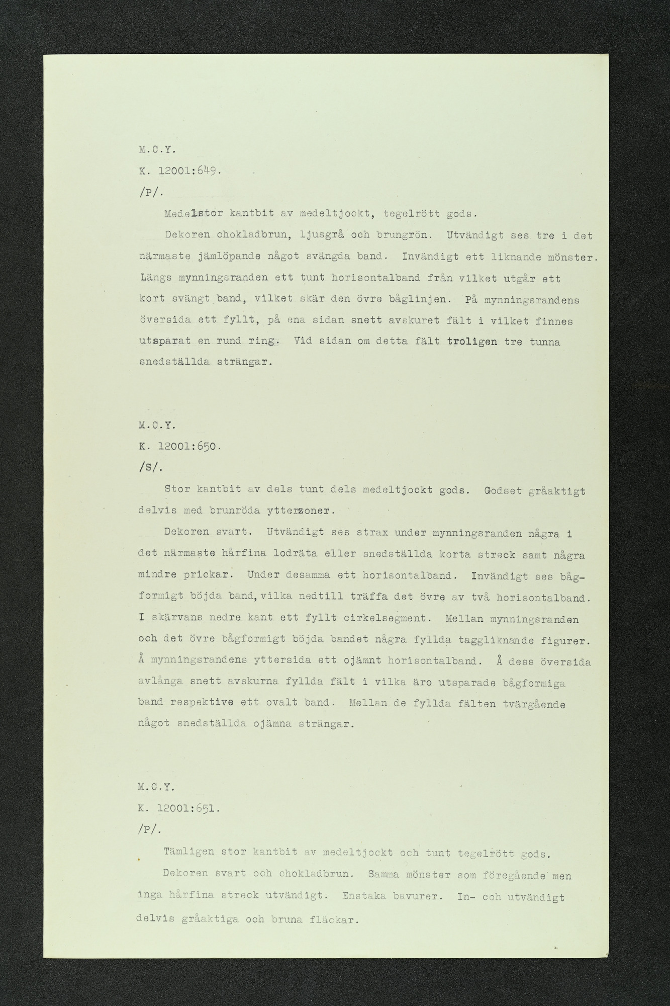 • Ma Chia Yao. Beskrivning av målade keramikskärvor av Nils Palmgren. K 12001: 1-78, 585-929, 1108-1508.