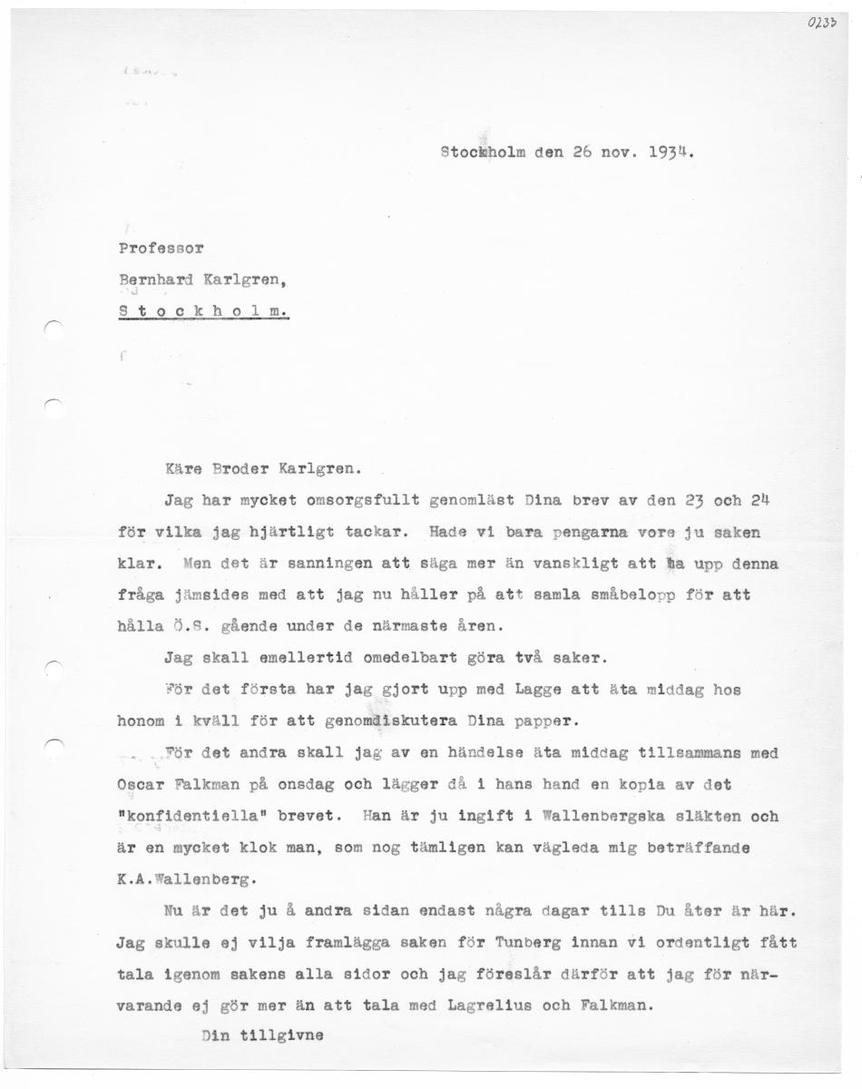 • Stockholm den 26 nov. 1934, Professor Bernhard Karlgren, SsStoekhol ms Käre Broder Karlgren. Jag har mycket omsorgsfullt genomläst Dina brev av den 23 och 24 för vilka jag hjärtligt tackar. Hade vi bara pengarna vore ju saken klar. Men det är sanningen att säga mer än vanskligt att ba upp denna fråga jämsides med att jag nu håller på att samla småbelopp för att hålla Ö.9S., gående under de närmast... Visa hela
