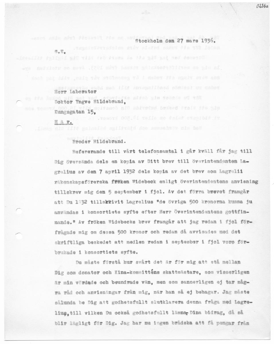 • ftockholm den 27 mars 1936, fRerr Laborator Doktor Yngve fildebrand, Kungsgatan 15, HAr Broder Hildebrand. Refarerande till vårt telefonsamtal 1 går kväll får jag $11l Dig översända dels en kopia av D... Visa hela