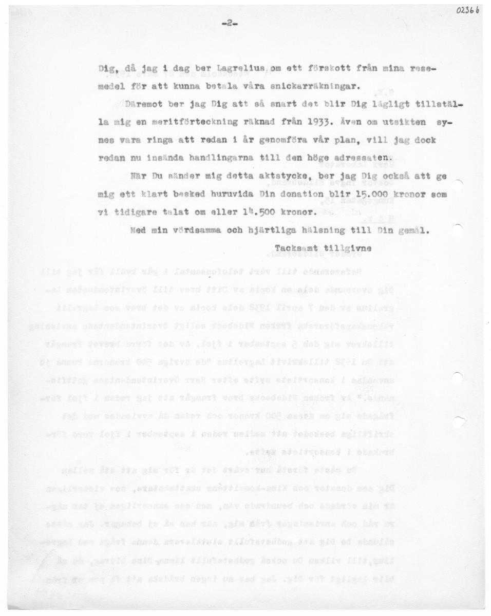 • 0236 b Dig, då jag i dag ber Lagrelius om ett förskott från mina rese- medel för att kunna betsla våra snickarräkningar. Däremot ber jag Dig att så snart det blir Dig lägligt tillstäl- la nig en seritförteckning räknad från 1933. Även om utsikten sy- nos vara ringa att redan i år genomföra vår plan, vill jag dock redan nu insända handlingarna $ill den höge adrassaten: När Du sänder mig detta aktst... Visa hela