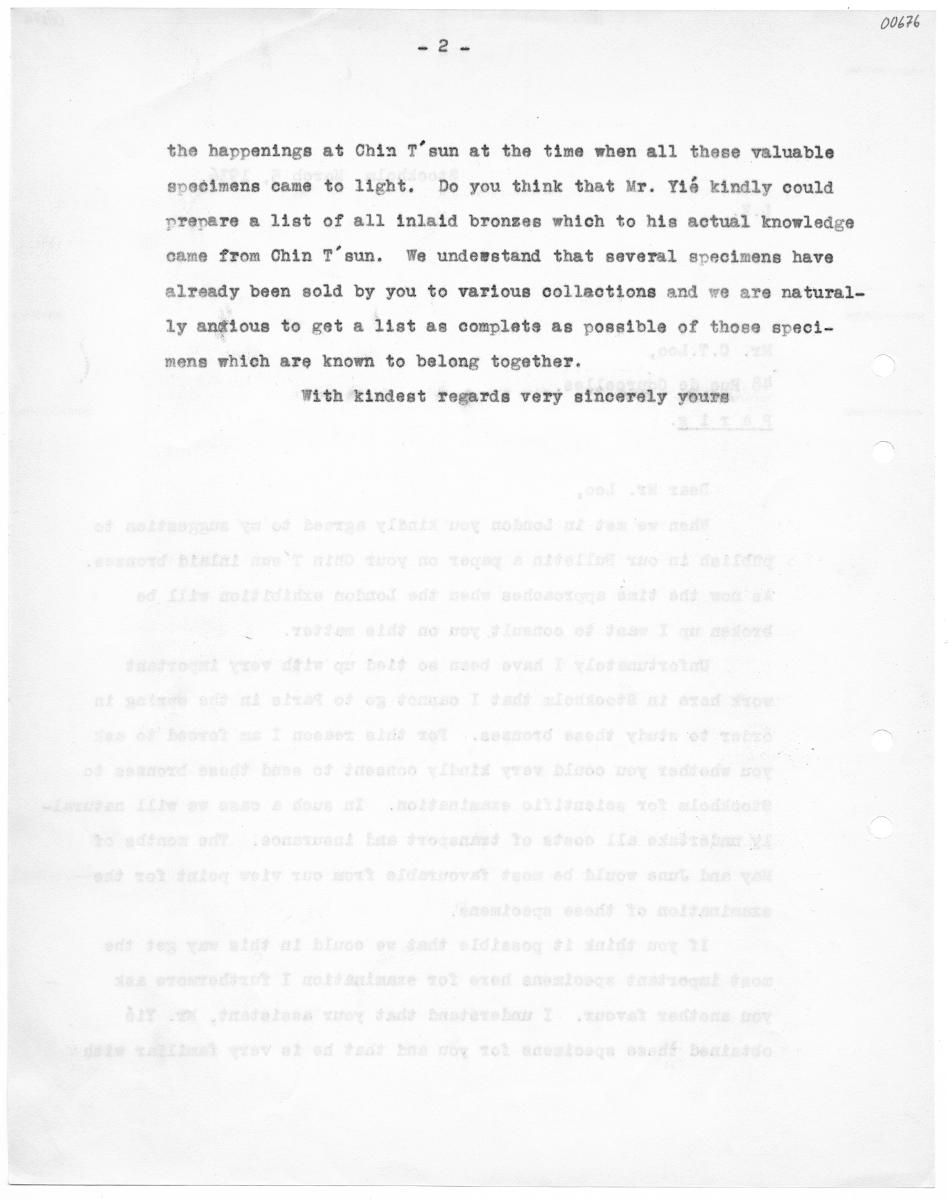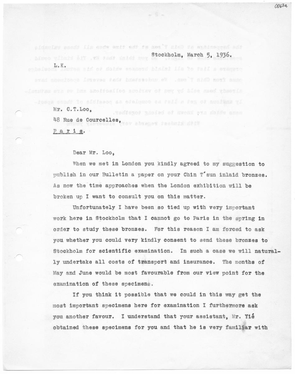 • 00672 Stockholm, March 5, 1936. Mr. 0.7.Loo, 48 Rue de Courcelles, raris. Dear Mr. Loo, vhen we met in London you kindly agreed to my suggestion to publish in our Bulletin a paper on your Chin T'sun inlaid bronzes. As now the time approaches when the London exhibition will be broken up I want to consult you on this matter. Unfortunately I have been so tied up with very important work here in Stock... Visa hela