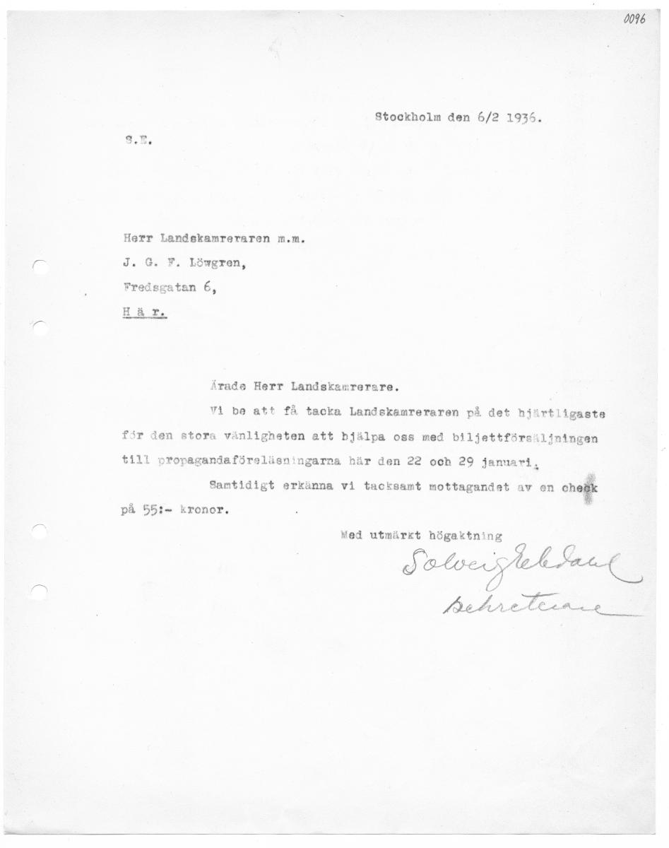 • id 0096 Stockholm den 6/2 1935. Herr Landskamrertaten m.m. J. 6. F. Löwgren, Fredsgatan 6, Här. Ärade Herr Landskawrerare. Vi be att få tacka Landskamreraren på det hjärtligaste för den stora vänligheten att bjälpa oss med biljettförsiliningen till propagandaföreläsningarna här den 22 och 29 januari, Samtidigt erkänna vi tacksamt mottagandet av on cholk på 55:= kronor. Med utmärkt högaktning Sölve... Visa hela