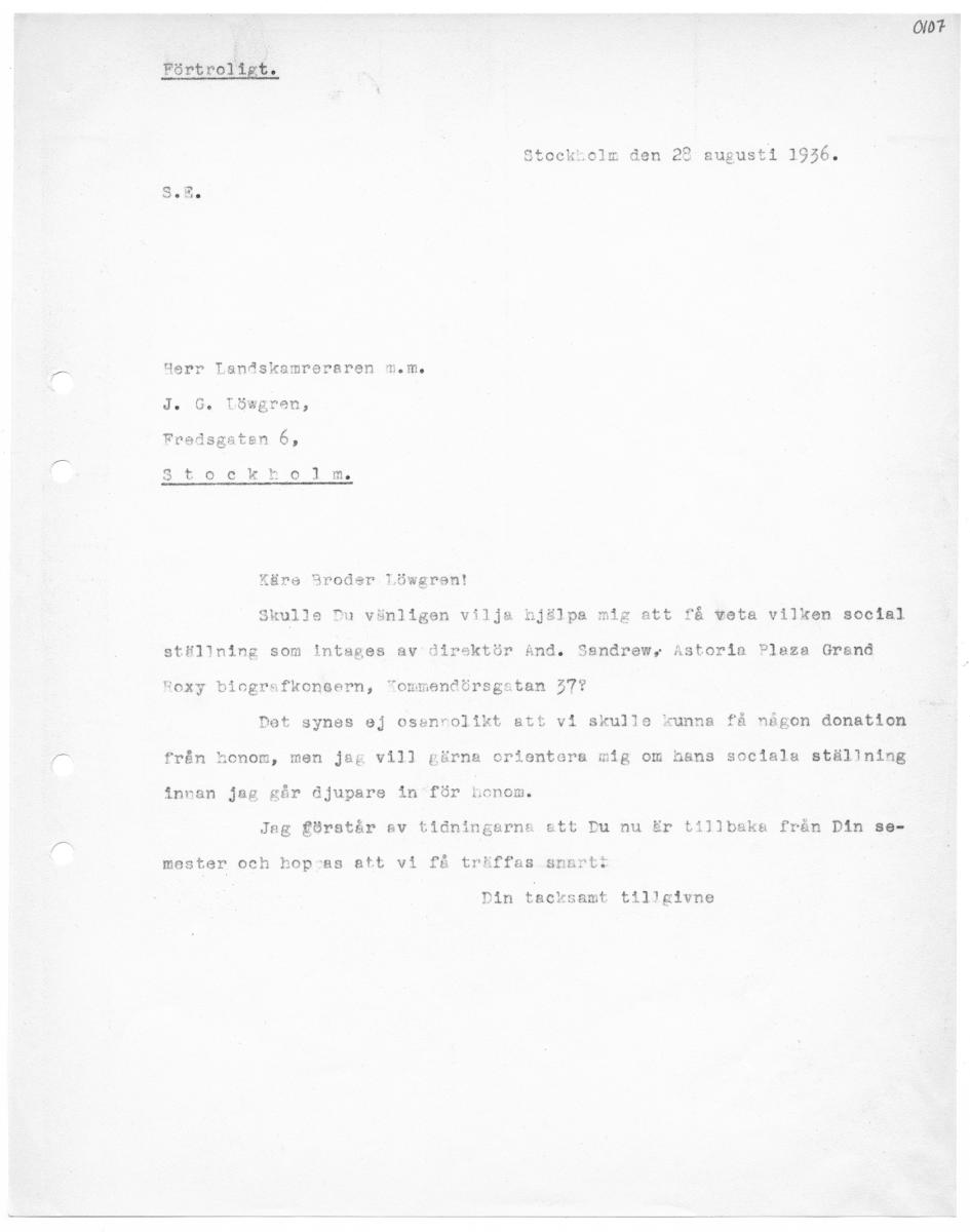 Förtroligt. Stocktolr den 22 augusti 1936. SS... Herr Tandskomreraren m.m. J. 0. Tövgran, Fredsgaten 6, $Stoecekrolm äre 3roder Löwegren! Skulle Du vänligen vilja hjälpa mig att få vete vilken social stillning som Intages av dirsktör And. Sendrew, Astoria Plaza Grand Foxy biogrufkonsern, ”ommendörsgatan 37? Det synes ej osennolikt stt vi skulle kunna få någon donation från honom, men jag vill pirn...
