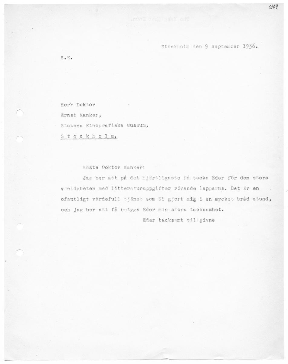 009. 9 Stookrkelm den 9 aeptewber 1936. Herr Doktor Ernst Manker, Statens Etnografiska Wuscum, Stockholm Bäste Pokter Mankar! Jag ber att på get tacka Eder för den stora vinligbeten med litters"uruppgifter rörande lapparne. Det är en ofantligt värdefull tjlnst som Ki gjort nig i en mycket bråd stund, och jsg ber ett få betyga Eder min stors tacksemhet. Eder tuctssmt ttligivne