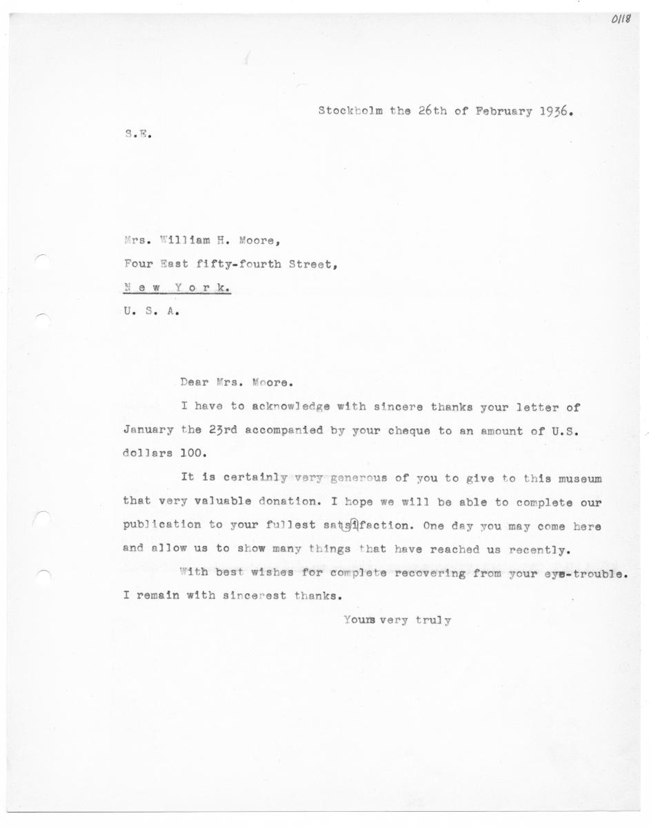ol Stocktolm the 26th of Februsry 1936. Nrs. William H. Moore, Four Eest fifty-fourtn Street, LJ DIR ER U. S. Av Dear Kra. Moore. I have to acknowleége with sincere thanks your letter of January the 23rd accompanied by your cheque to an amount of U.S. dollars 100. It is certainly very generous of you to give to this museum that very valurble donation. I hope we will be able to complete our publication to your fullest satgifection. One day you may come here and allow us to skow many things that have reached us recently. With best wishes for complete recovering from your eyb-trouble. I remsin with sincerest thanks. Youm very trulyStäng