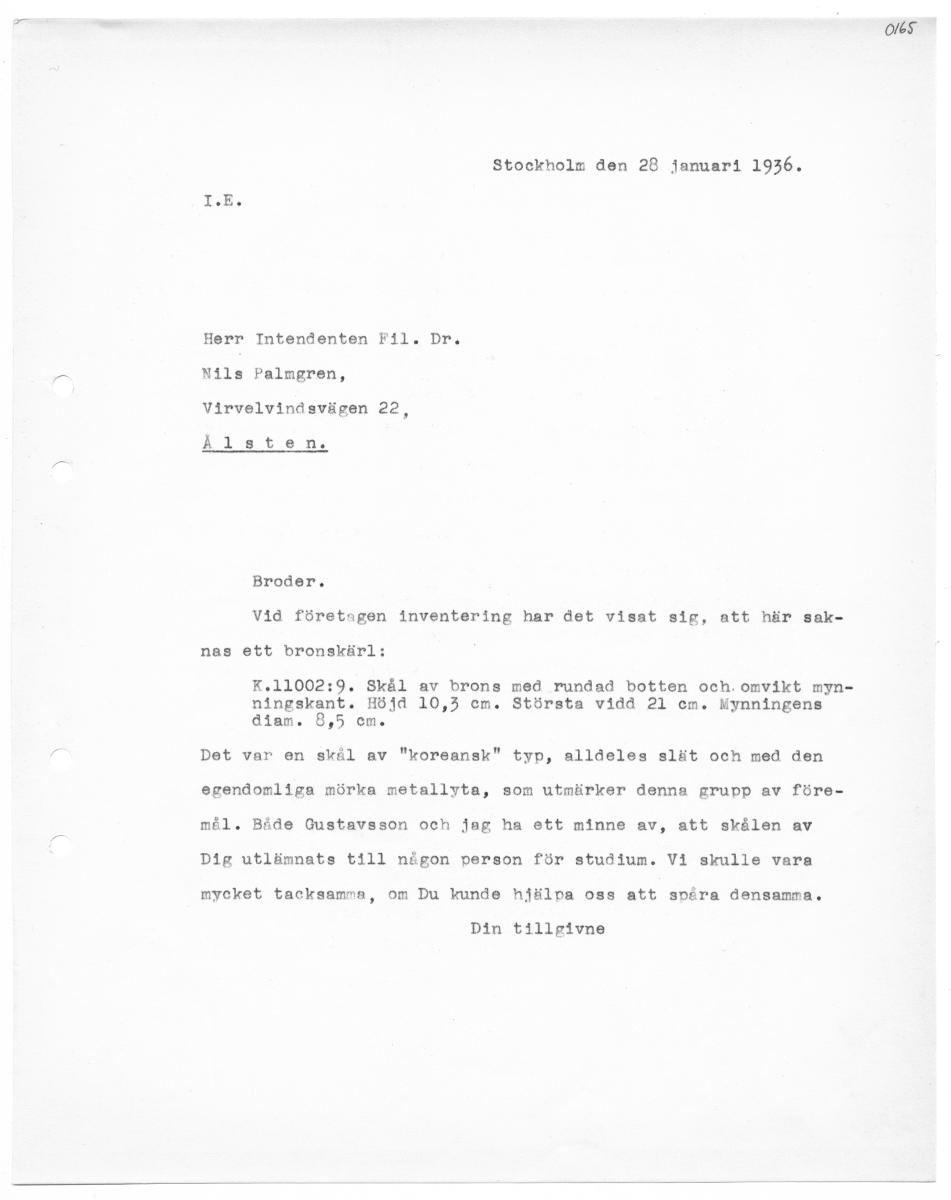 OS Stockholm den 28 januari 1936. Herr Intendenten Fil. Dr. Nils Palmgren, Virvelvindsvägen 22, Ålsten, Broder. Vid företagen inventering har det visat sig, att här sak- nas ett bronskärl: K.11002:9. Skål av brons med rundad botten och. omvikt myn- ningskant. Höjd 10,3 em. Största vidd 21 em. Mynningens diam. 8,5 om. Det var en skål av "koreansk" typ, alldeles slät och med den egendomliga mörka me...