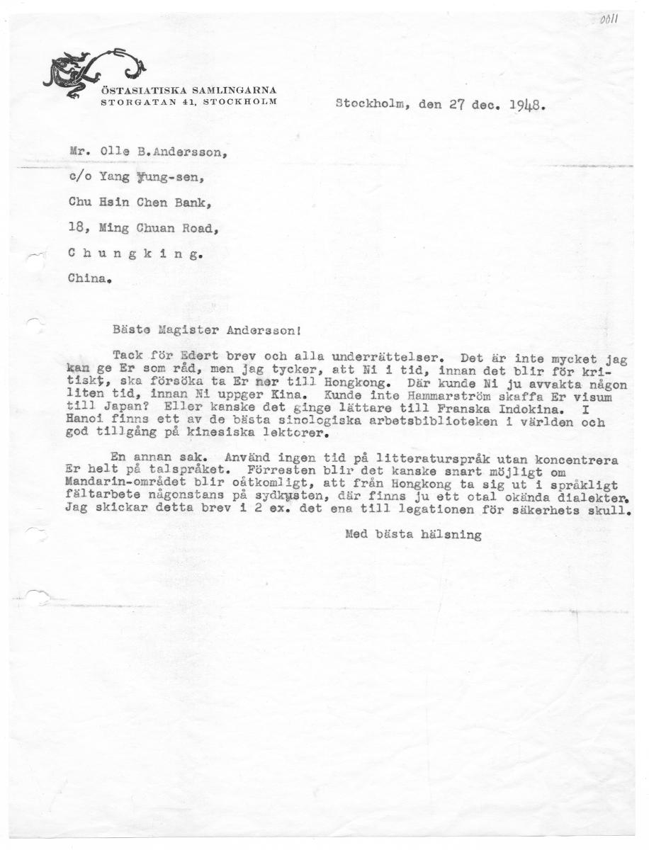 • o0MM ÖSTASTATISKA SAMLINGARNA STORGATAN 41, STOCKHOLM Stockholm, den 27 dec. 1948. Ur. Olle B.Andersson, e/o Yang Fung-sen, Chu Esin Chen Bank, 18, Ming Chuan Road, Chungking. China, Bäste Magister Andersson! Tack för Edert brev och alla underrättelser. Det är inte mycket jag kan ge Er som råd, men jeg tycker, att Ni 1 tid, innan det blir för kri- tisk$, ska försöka ta Er ner till Hongkong. Där ku... Visa hela