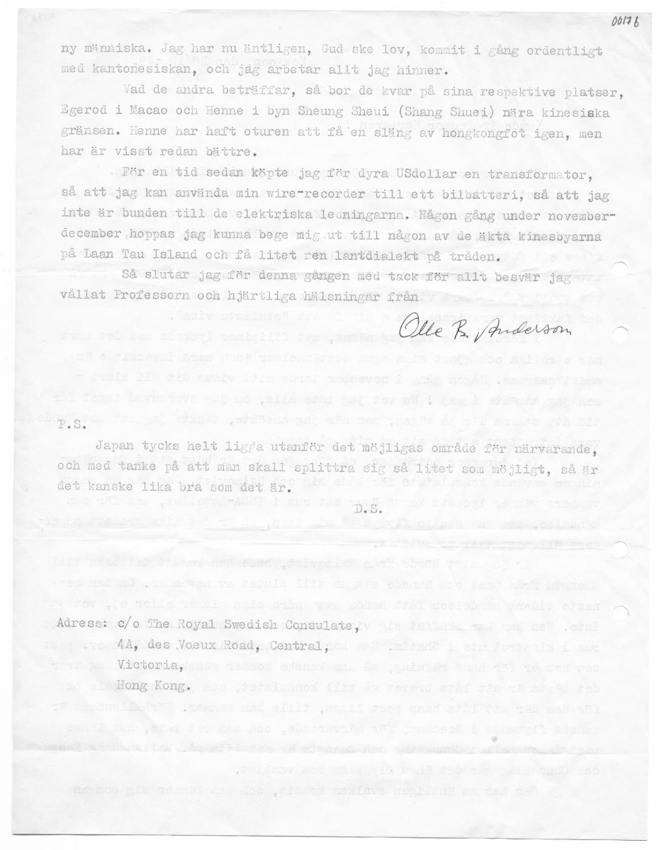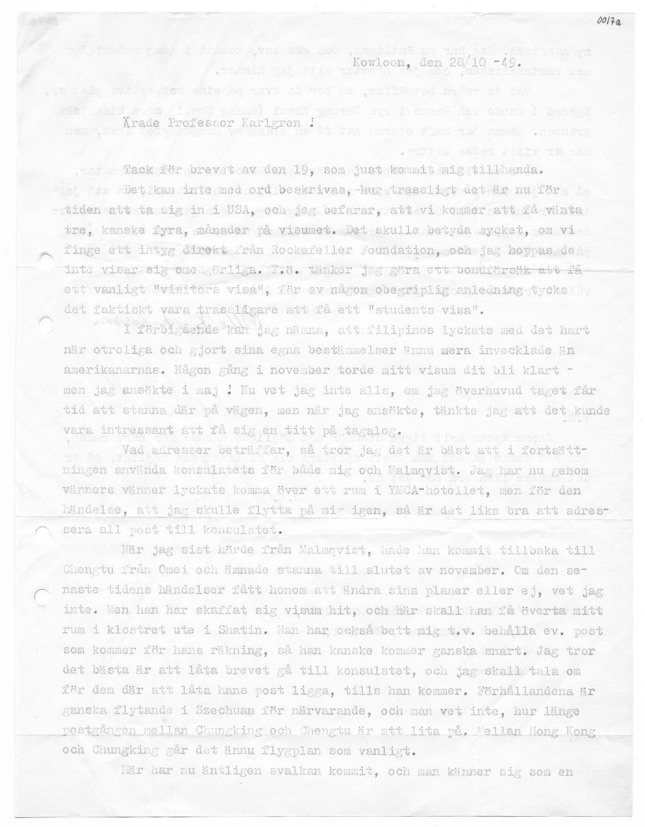 • Kowloon, åen 28/10 -Å9. Ärade Professor Karlgren I Tack för brevat av den 19, som justskonnit mig tillhanda. Detikan intesmed ord beskrivas, -nustraseligt detär nuiför tiden att te sig in i.UVUSA, och jag befarar; att vi kommer -att få vänta tre, kanske fyra, månader få visumet. Det skulle betyda mycket, om vi finge ett intyg direkt Crån Rockefeller soundationysoehsjag hoppasade inte visarssig ome... Visa hela