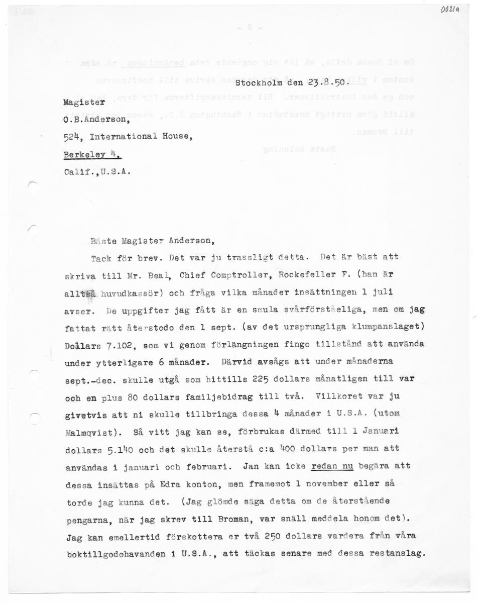 • bb2a Stockholm den 23.8.50. Magister O0.B.Anderson, 524, International House, Berkeley 4, Calif.,U.S.A. Bäste Magister Anderson, Tack för brev. Det var ju trassligt detta. Det är bäst att skriva till ... Visa hela