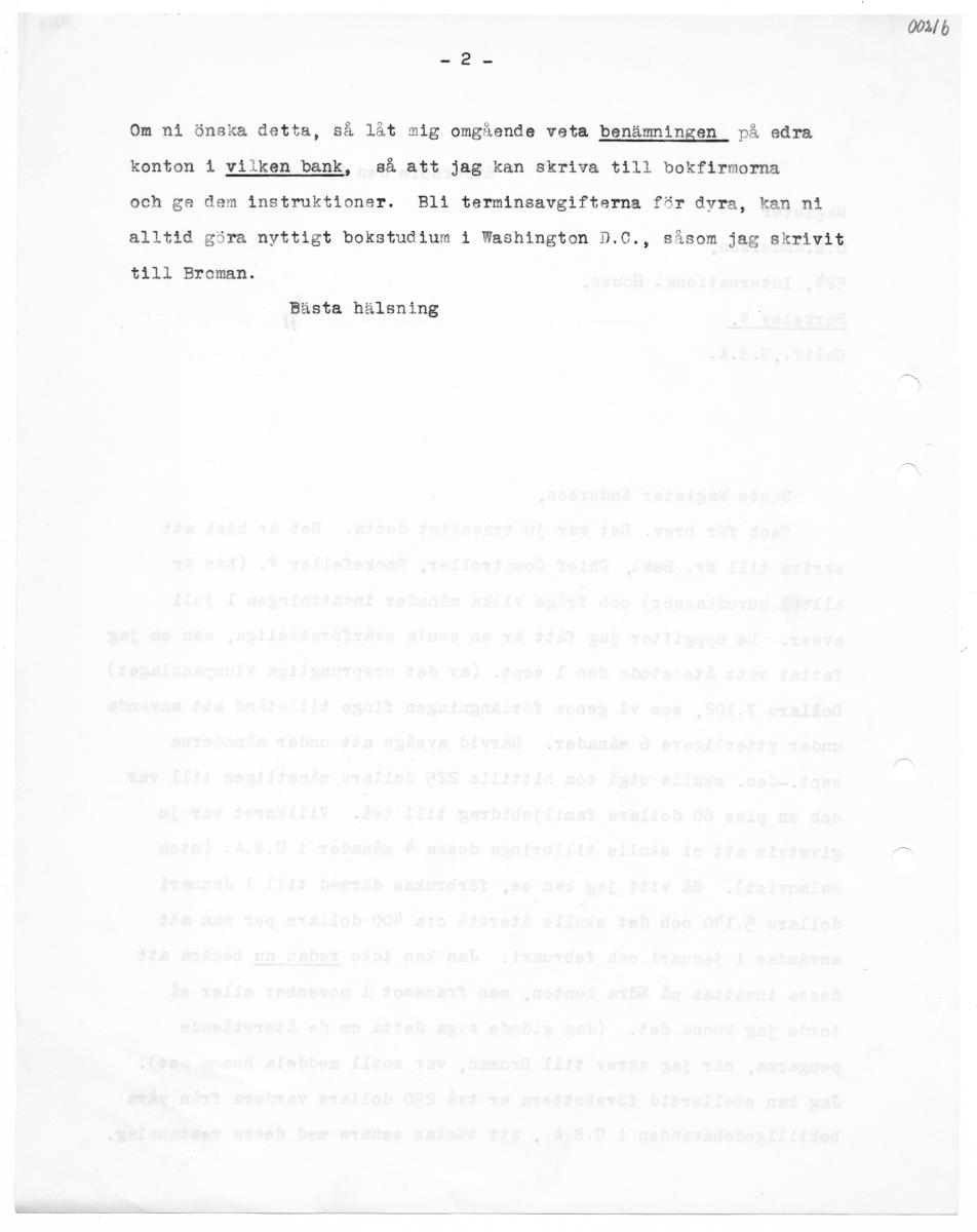 • 00216 Om ni önska detta, så låt mig omgående veta benämningen på edra konton 1 vilken bank, så att jag kan skriva till bokfirmorna och ge dem instruktioner. Bli terminsavgifterna för dyra, kan ni alltid göra nyttigt bokstudium i Washington D.C., såsom jag skrivit till Broman. Bästa hälsning