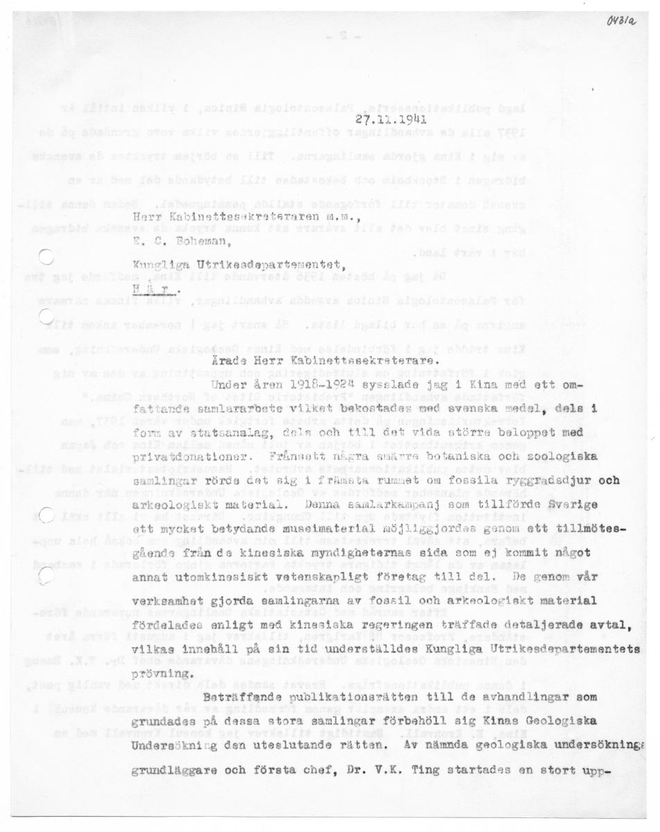 vara 27.12.1941 Harr Kabinsttesakrateraren A.m., FE. C. Boheman, Kungliga Utrikeadepartenentet, Ärada Herr Kablnettssekraterare. Under åren 1918-1924 sysslade jag 1 Kina med ett om- ande sumlararbete vilket bekostades med svenska medal, dels 4 av statsanalag, dala och till det vida större beloppet med förr privatdonationer. Frånsott några smärre boteniska och 200logiska ta mumset om fossila ryggradsdjur och samlingar rörde dat sig 1 arkeologiskt material. Denna samlarkampanj som tillförde Sverige ott mycket betydande museimaterlal möjliggjordas genom ett tillmötes- gående från de kinesiska myndigheternas sida som ej kommit något annat utomkinasiskt vetenskapligt företag till del. De genom vår verksanhet gjorda samlingarna av fossil och arkeologiskt material fördelades enligt med kinesicka regeringen träffade detaljerade avtal, vilkas innehåll på ein tid underställdes Kungliga Utrikesdenartementets prövning. Baträffande publikationsrätten tilll de avhandlingar som grundades på dessa stora samlingar förbaehöll sig Kinas Geologiska Undersökning den uteslutande rätten. Av nämnda geologiska undersökning: grundläggare och första chef, Dr. V.K. Ting startades en stort upp.