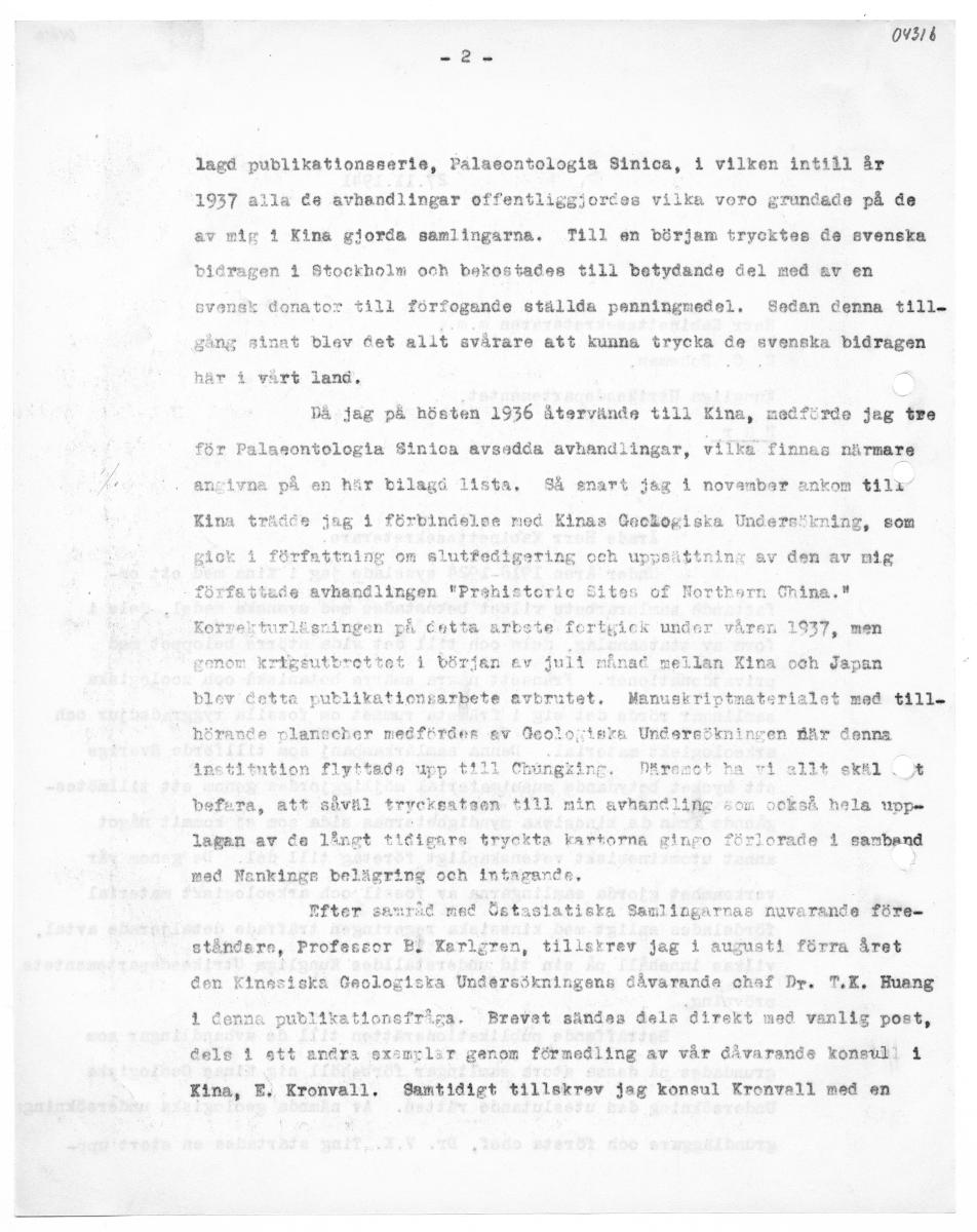 09314 lagd publikationsserie, Palaeontologia Sinica, i vilken intill år 1937 alla €e avhandlingar offentliggjordes vilka voro grundade på de av mig 1 Kina gjorda samlingarna. Till en börjam trycktes de svenska biéragen 1 Stockholm och bekostades till betydande del med av en ovensk donator till förfogande ställda penningmedel. Sedan denna till. gång sinat blev éet allt svårare att kunna trycka de svenska bidragen här i vårt land. - DÅ jag på hösten 1936 återvände till Kina, medförde jag tre för Palaeontologia Sinioa avsedda avhandlingar, vilka finnas närmare ancivna på en här bilagd lista, Så snart jag 1 novambar ankom $ilx Kina trädée jag 1 förbindelse med Kinas Geckogiska Undersökning, som giok 1 författning om slutfedigering och uppsättning av den av nig författade avhandlingen "Prshistoric Sites of Northern China." Korvelturläsringen på Cetta arbste fortgick under våren 1937, men gmon kriksuttrettet 1 början ev juli nånad mellan Kina och Japan blev estta publikationsarbete avbmitet. Manuskriptmaterialet med till. hörande nlanocher medförder &v Geolotera Under: incen fär denna Anetitntion flyttade upp till Chingking. Närosct ha vi allt ekkl. t också hela upp lorade 1 samband befara, att såväl trycksatsen till min avhandling lagan av de långt tifigara tryckta kartorna ginpo med Nenkinge belägring och intagarén, Efter samråd med Östastatiska Ssamlingarnas nuvarande före- ståndern, Profeesor BI Kerlgren, tillskrev jag i augusti förra året den Kinesiska Geologiska Undersökningens dåvarande chaf Dr. T.K. Huang 1 Cenna publikationsfriga. Brevat sändes dela direkt med vanlig post, éele 1 stt andra exsnrlir genom förmedling av vår dåvarande konstll 4 Kina, E. Kronvall, Samtidigt tillskrev jag konsul Kronvall med en