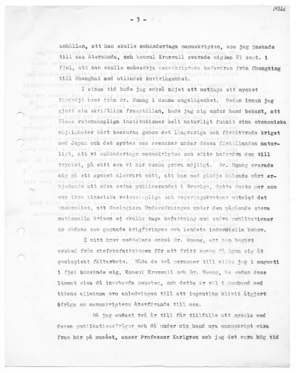 anhållan, att han skulle ombändertaga manusktiptan, som jag Snskade till oss återsända, ooh konsul Kronvall svarade migåen 21 sapt. 4 fjol, att han skulle ombesörja manvskrtiptens bafordran från Chungking till Shanghai med utlänösk kurirlägenhet. I sinom tid hade jag också nöjet att mottaga att mycket fördröjt brev från br, Fuang i denna angelägenhet. HRadan innan jag gjort mia skriftliga fra: Allan, hade jag mig uader hand bekant, att Xinus vetenskapliga institutioner helt naturligt funnit sina ekonomiska möjligheter hårt beskurna genom det lingvsriga och förbittrade kriget med Japan och det syntas 083 evenskar under dessa förhillanden natur. ligt, att vi owbändertogo manuskripten och sökte befordra den till trycket, på sätt saom vi här kunda pröva möjligt. Dr. Hyang svarade mig på ett mycket älskvärt sätt, att han med glädje hälsade vårt er- bjudande att söka ordna publisarandet 1 Svarige, detta dosto mer som man inom kinesiska vetenskapliga och regeringskretsar uttelgt det önskemilat, att Crologisks Undersökningen under den påskende stora nationella krisen ej skulle taga befattning mad andra publikationer än sådana som gacnade krigföringen och landets industriella behov. I mitt brav maddaladé neckså Nr. Hunng, Att han bestrt aveked från chefebefattninsen för att fritt kunna Å ägna sig At geologiskt fältarbete, Båda de två personer till vilka jag i maupueti 4 fjol hinvände mig, Konsul Kronwall och Pe. Huang, ha sedan dessa lämnat sina då innehavda Ambeten, och detta är vil 4 samband med tidens allmänna oto anledningen till att ingenting blivit Åtgjort åfråga om manuskriptens Åtarförande till oss. DÅ jag endast två år till får tillfälle att ayssla med dessa pudlikatlonsfrågor och då under min hand nya manuskript växa fram här på musået, anser Professor Karlgren och jag det vara hög tid