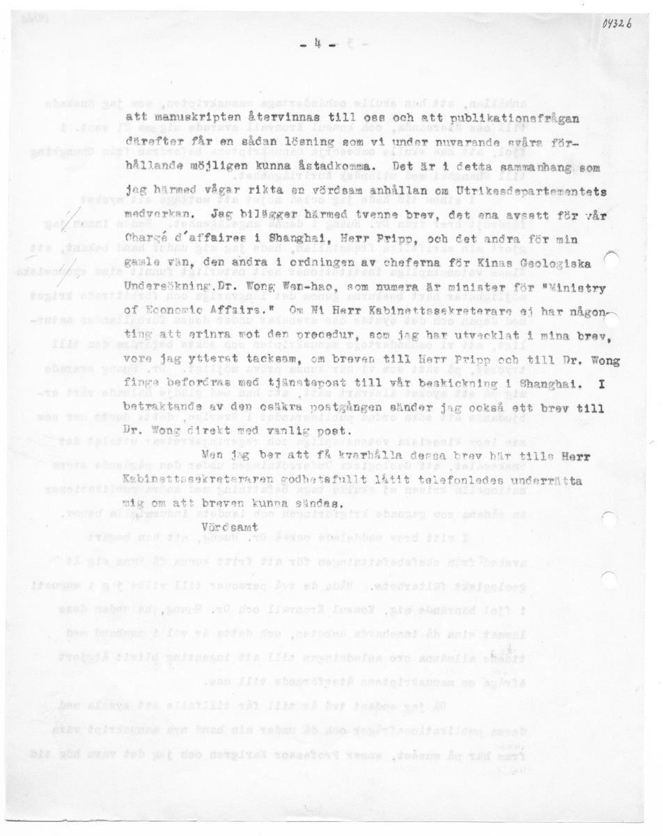 0y326 att manuskripten återvinnas till oss och att publikationafrågan Atrafter får en sådan lösning mom vi inder nuvarande svåra för. hållande möjligen kunna åstadkonma. Det är 4 fetta sammanhang som jag härmed vågar rikta en värdsam anhållan om Utrikesderartementets madvarkan, Jeg blögger härmed tvenne brev, det sana avsatt för vår fharså d"affairee 1 Shanghai, Herr Pripo, och det andra för min ganle vän, den anära 1 ordningen av cheferna för Kinas Geologiska Undersökning. Dr. Wong Wan-hao, som numera är minister för "Vinistry of Economic Affsirs." Om Hi Herr Kabinettssekrotarare ai har någon ting att erinra mot den orecedur, som jag har utvacklat 1 mina brev, vore jag ytterst tacksam, om breven $ill Herr Prinp och till Dr, Wong finga beforéras med tjänntapsst $111 vår beskickning 1 Shanghai, I betraktande av den ostkra postgången sänder jag också ett brev $111 Dr, Wong Etirekt med vanlig poet. Van Pg ber att få kvarhålla dessa brav hur tilla Herr Kabinettusseretararen modhaetefnllt låtit teisfonledes underrätta mig om att breven kunna säindag, Värd sant