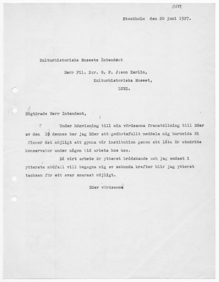 0584, Stockholm den 20 juni 1927. Kulturhistoriska Museets Intendént Herr Fil, Dir. G. F. J:son Karlin, Kulturhistoriska Museet, LUND. F På Högtärade Herr Intendent, i r Under hänvisning till min vördsamnma framställning till Eder av den 19 dennes ber jag Eder att godhetsfullt meddela mig huruvida Ni finner det möjligt att gynna vår institution genom att låta Er utmärkte konservator under någon tid arbeta hos bss. Då vårt arbete är ytterst brådskande och jag endast i säkarsta nödfall vill begagna mig av sekunda krafter blir jag ytterst tacksam för ett svar snarast möjligt. Eder vördsamme