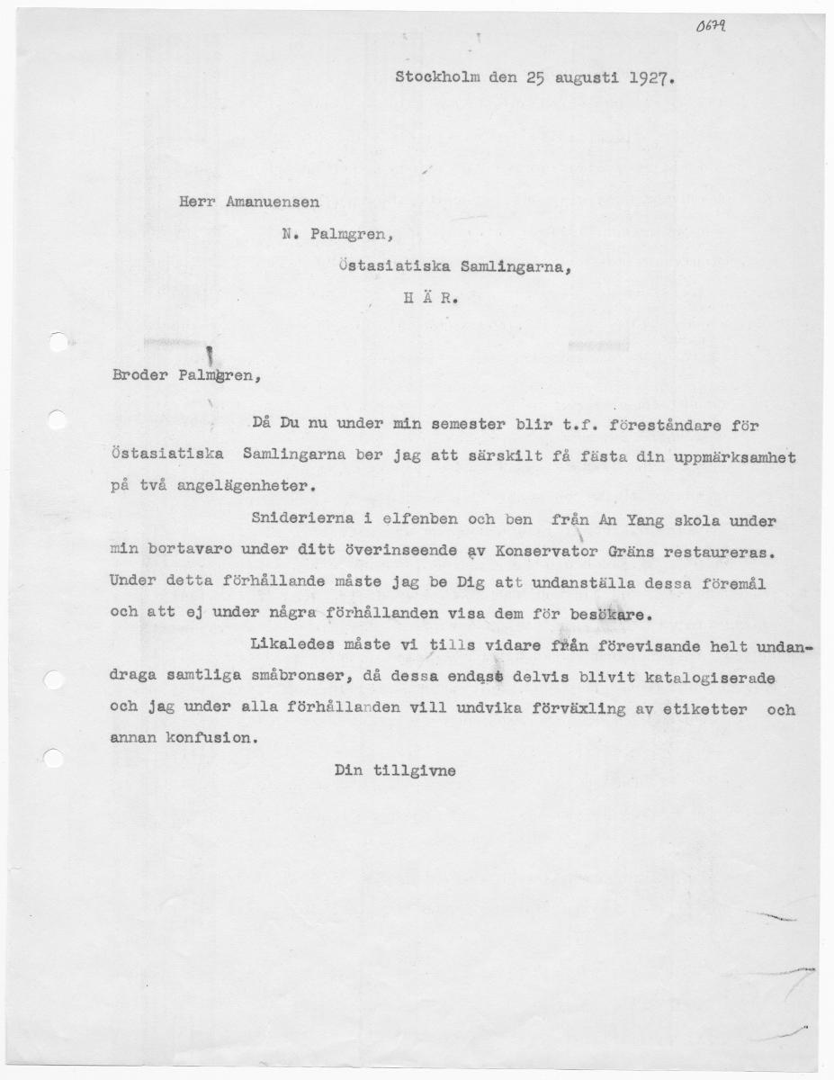 06 r Stockholm den 25 augusti 1927. Herr Amanuensen N., Palmgren, Östasiatiska Samlingarna, HÄR: Broder Palmgren, Då Du nu under min semester blir t.f. föreståndsre för Östasiatiska Samlingarna ber jag att särskilt få fästa din uppmärksamhet på två angelägenheter, | Sniderierna i elfenben och ben från An Yang skola under min bortavaro under ditt överinseende av Konservator Gräns restaureras, Under...