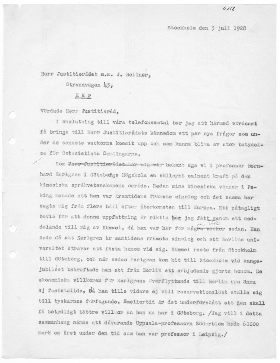 O218 Stockholm den 3 juli 1928 Herr Justitierådet m.m. J, Hellner, Strandvägen l;3, Hör Vördade Herr Justitlieråd, I anslutning till våra telefonsamtal ber jag att härmed vördsamt få bringa tlll Herr Justitierådets kännedom att par nya frågor som un» åer de saneate veckorna kommit upp och som kunna bliva av stor betydel. se för Östasiatiska Semlingearna, 2 harå Kerlgren i Götebofgs Högskola en sällsynt eminent kraft på den &r bekant tiga vl i professor Berne kinesiske språkvetenskapens område, heden mina kinesiska vänner i Pe. king menade att han var (samtidens främste alnolog och det samma har sagts nig från flere håll efter återkomsten till Burppa., Ett påtagligt bavis för att denne uppfattning är riktiga her jag fått g nom ett med. delande tilll mig ev Kuäummel, då han var här för några veckor sedan. Han sade då att Kerlgren är samtidens främste sinolog och att Berlins uni. versltet strävar att fästa honom vid sig. Kummel reste från Stockholm till Göteborg, och när sedan farlagren kom hit till Stocknolm vid KUnge.= jubileet bekräftade han att från Berlin ett erbjudande gjorts honom, De ekonomiska villkoren för Kaerlgrena överflyttande till Berlin äro ännu ej fastställda, Då han tills vidare ej vill reservationslöst ställa sig till tyskarnas förfogande, Emellertid är det underförstått att jan skall få betydligt bättre villkor än han nu har 1 Göteborg, /Jag vill 1 detta sammanhang nämna att dåvarande Uppsala-professorn Söderblom hade 60000 mark om året under den tid som han var professor 1 Lelpzig./