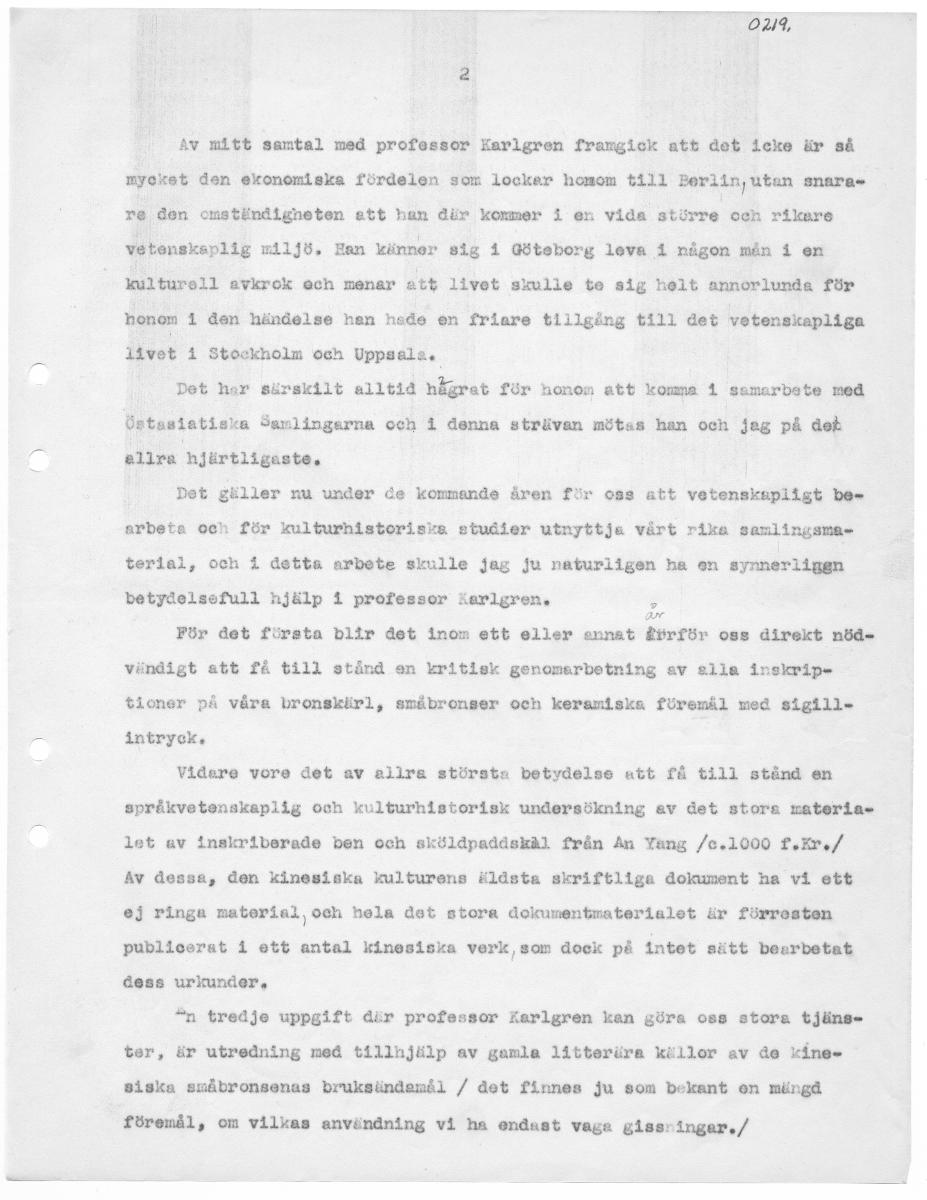 O29, Av mitt samtal med professor Karlgren framgick att det icke är så myok zxet den ekonomiska fördelen som lockar nhomom till Berlin, utan snara. ra den oms tändigneten att han där kommer i en vida större och rikare vetenskaplig miljö, Hen känner sig i Göteborg leva I någon mån i en kulturell avkrok ech menar utt livet skulle te sig helt annorlunda för honom 1 den händelse hen hade en friare tillgång till det veten skapliga itvet Få Stockholm och Uppsala. | Det har särskilt alltid högrat för nonom att komna vå semarbote med Östasiatiska Sarlingarna och i denna sträven mötes han och jeg på det | I I allra hjärtligaste, — Det gäller nu under de kommande åren för 088 att vetenskapligt be. arbeta och för kulturhistorisis studier utnyttja värt rika samlingsma= terlal, och i detta arbete skulle jag ju naturligen ba en synnerliggn betydelsefull njälp I professor jerlgren. 2 För det första blir det inom ett eller annat körför oss direkt nöd. vändigt att få till stånd en kritisk genomarbetning av alia inskvip- tioner på våra bronskärl, småbronser och keramiska föremål med sigill. intryck. Videre vore det av allra största betydelse att få till stånd en språkvetenskapiig och kulturhigtorisk undersökning av det stora materia. let av inskriberade ben och sköldpaddskal från Ån Yang /e.1000 f.Er./ Av dessa, den kinesiska kulturens äldsta skriftliga dokument ha vi ett ej ringa material, och hela det stora dokumentmaterlialet är förresten publicerat i ett antal kinesiska verk,som dock på intet sätt bearbetat dess urkunder. ”n tredje uppgift där professor Karlgren kan göre oss stora tjäns. ter, är utredning meå tillnjälp av gamla litterära källor av åe king. siska småbronsenas bruksändemål / det finnes ju som bekant en mängd föremål, om vilkas användning vi ha endast vega glssringar,/