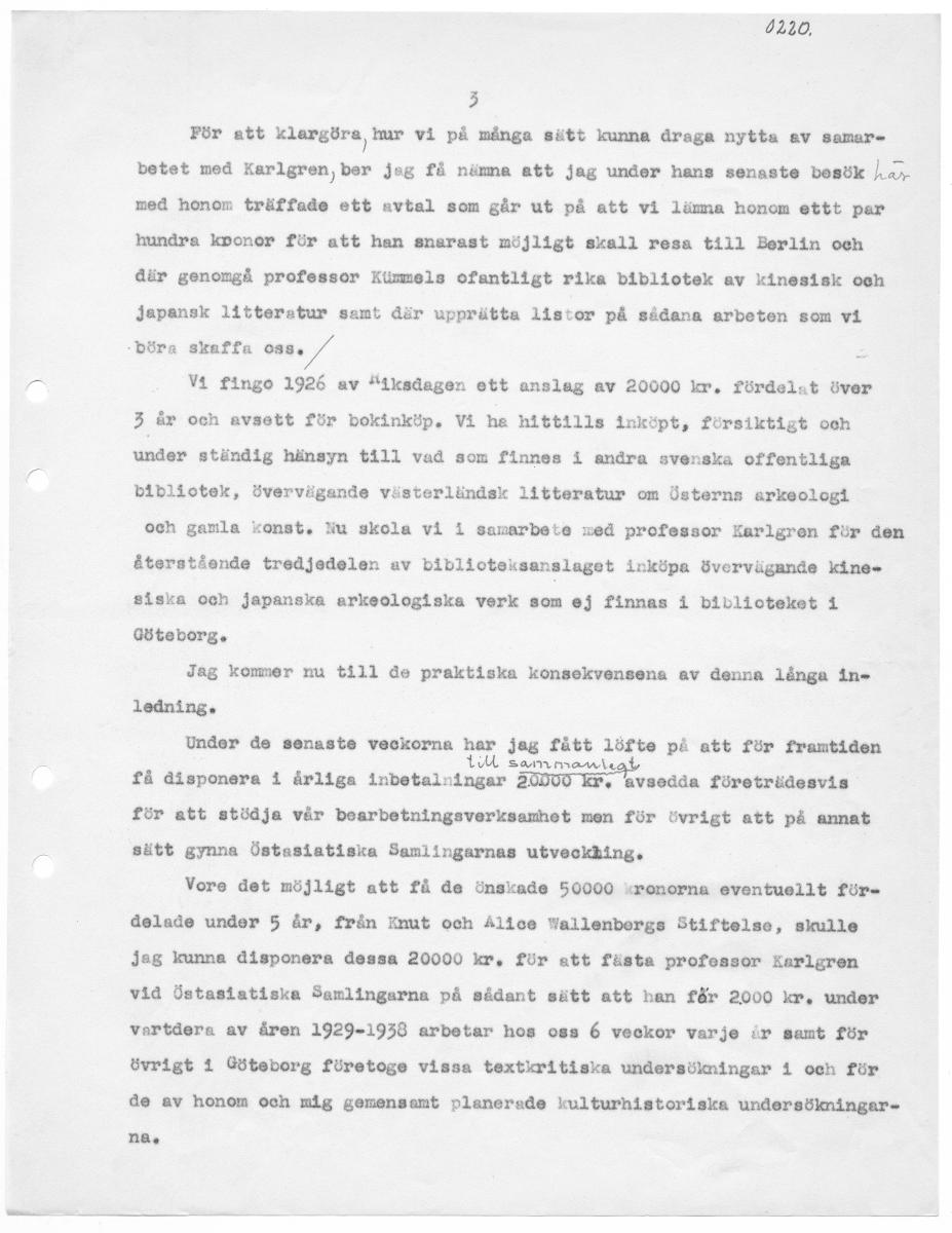 I220, å För att klargöra hur vi på många sätt kunna draga nytta av samar betet med ärläira Oi jeg få nämna ett jag under hans senaste besök fak med honom träffade ett avtal som går ut på att vi lämna honom ettt par hundra koonor för att han snarast möjligt skall resa tilll Berlin och där genomgå professor Kusmels ofantligt rika bibliotek av kinesisk och japansk litteratur samt där upprätta listor på sådana arbeten som vi böra skaffa 088. / = Vi fingo 1926 av "iksadagen ett anslag av 20000 kr. fördelat över 3 är och avsett för bokinköp., Vi he hittills inköpt, försiktigt och under ständig hänsyn till vad som finnes 1 andra svenska offentliga bibliotek, övervägande västerländsk litteratur om Österns arkeologi och gamla Konst. Nu skola vi i samarbete med professor Karlgren för den återstående tredjedelen av biblioteksanslaget inköpa övervägande kine. siska och japanska arkeologiska verk som ej finnas i biblioteket i Göteborg. Jag kommer nu till de praktiska konsekvensena av denna långa in» laddning. Under de senaste veckorna har jag fått löfte på att för framtiden rs nats få disponera i årliga inbetalningar 20 « avsedda företrädesvis för att stödja vår bearbetningsverksamhet men för övrigt att på annat 'sätt gynna Östaslatiska Samlingarnas utveckhing. Vore det möjligt att få de önskade 50000 kronorna eventuellt för delade under 5 år, från Enut och Alice Wallenbergs Stiftelse, skulle jeg kunna disponera dessa 20000 kr. för att fästa professor Kerlgren vid Östasiatiske Samlingarna på sådant sätt att han för 2000 kr, under vartdera av åren 1929-1938 arbetar hos oss 6 veckor varje ir samt för övrigt i Göteborg företoge vissa textkritiska undersökningar 1 och för de av honom och mig gemensamt planerade kulturhistoriska undersökningar. na,