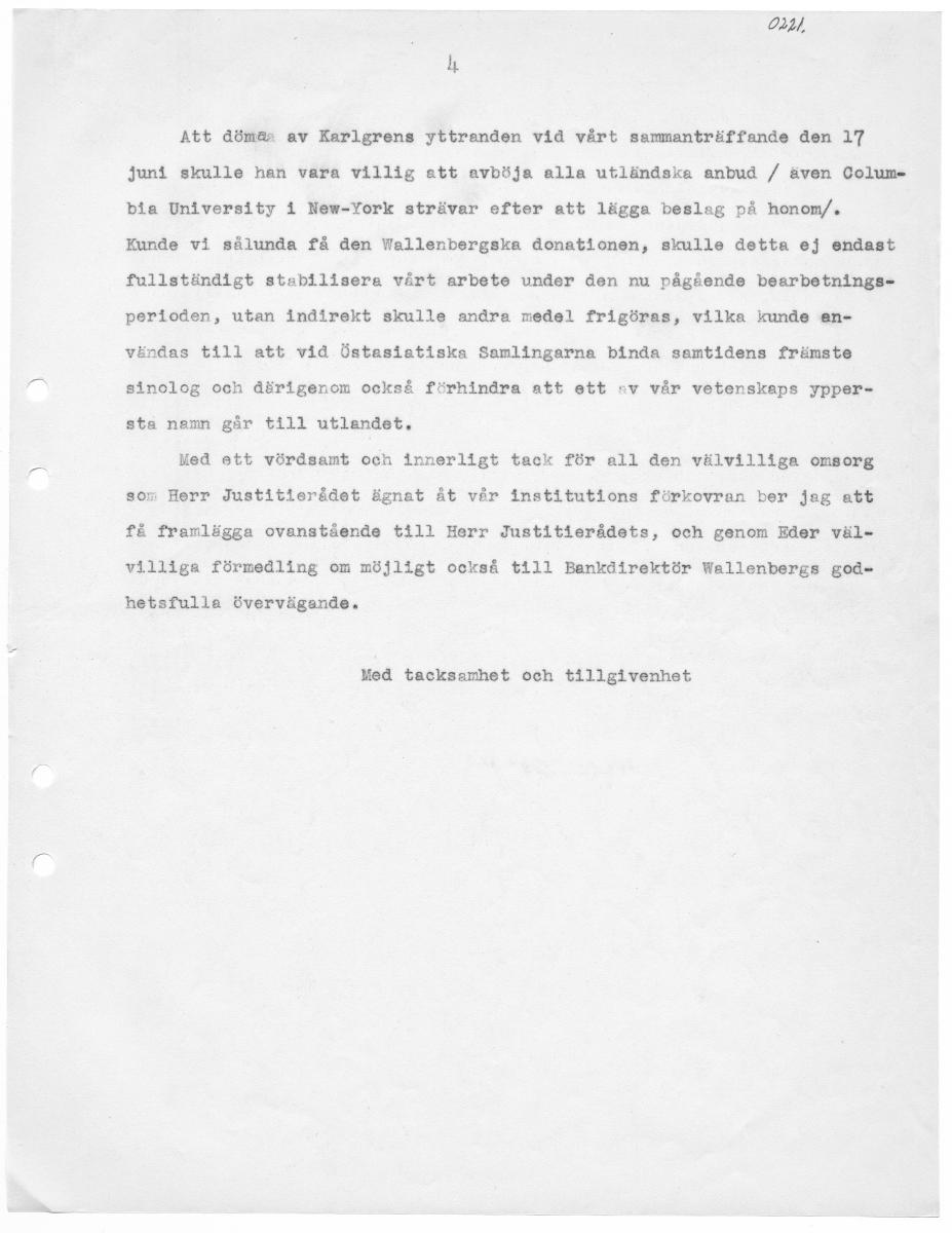 OZ, Att dömas av Karlgrens yttranden vid vårt sammanträffande den 17 juni skulle han vara villig att avböja alla utländska anbud / även Colum- bia University i New-York strävar efter att lägga beslag på honom/. Kunde vi sålunda få den Wallenbergska donationen, skulle detta ej endast fullständigt stabilisera vårt arbete under den nu pågående bearbetnings- perioden, utan indirekt skulle andra medel frigöras, vilka kunde en- vändas till att vid Östasiatiska Samlingarna binda samtidens främste sinolog och därigenom också förhindra att ett av vår vetenskaps ypper- sta namn går till utlandet. Med ett vördsamt och innerligt tack för all den välvilliga omBorg som Herr Justitlerådet ägnat åt vår institutions förkovran ber jag att få framlägga ovanstående till Herr Justitierådets, och genom Eder väl- villiga förmedling om möjligt också till Bankdirektör Wallenbergs god- hetsfulla övervägande. Med tacksamhet och tillgivenhet