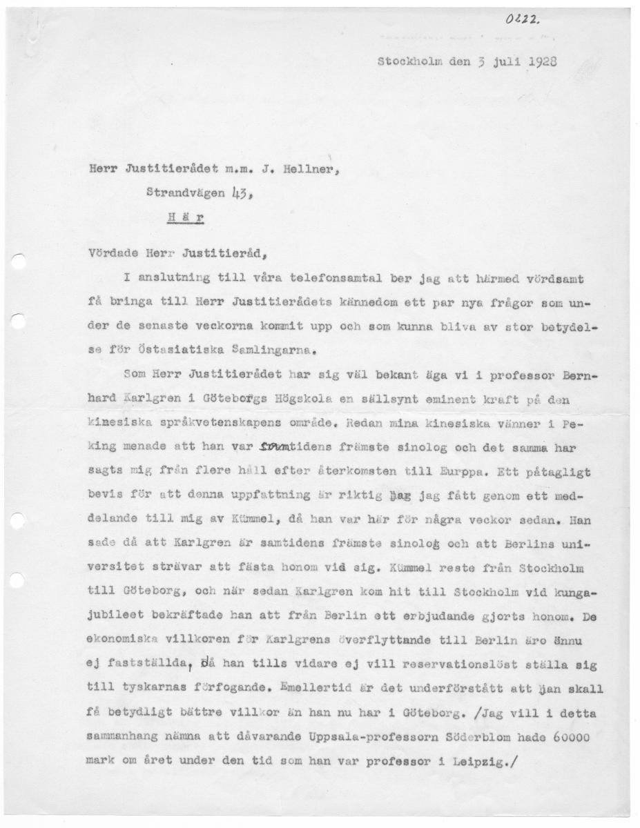0222. Stockholm den 3 juli 1928 Herr Justitierådet m.m. J. Hellner, Strandvägen lj3, Här Vördade Herr Justitieråd, I anslutning till våra telefonsamtal ber jag att härmed vördsamt få bringa till Herr Justitierådets kännedom ett par nys frågor som un- der de senaste veckorna kommit upp och som kunna bliva av stor betydel. se för Östaslatiska Semlingarne, Som Herr Justitierådet har sig väl bekant äga vi 1 professor Barns hard Xarlgren i Göteborgs Högskole en sällsynt eminent kraft på den | kinesiska språkvetenskapens område, Reden mina kinesiska vänner 1 Pe- king menade att han var f£vvmtidens främste sinolog och det samma har sagts mig från flere håll efter återkomsten till Eurppa. Ett påtagligt bevis för att denna uppfattning är riktig hag jag fått genom öv mede delande till mig av Kimmel, då hen var hör för några veckor sedan. Han sade då att Karlgren är samtidens främste sinolog och att Berlins uni. versitet strävar att fästa honom vid sig. Kummel reste från Stockholm till Göteborg, och när sedan Karlgren kom hit till Stockholm vid kunga- jubileet bekräftade han att från Berlin ett erbjudande gjorts honom. De ekonomiska villkoren för Karlgrens överflyttande till Berlin äro ännu ej fastställda, Hå han tills vidare ej vill reservationslöst ställa sig till tyskarnas förfogande, Emellertid är ået underförstått att jan skall få betydligt bättre villkor än han nu har 1 Göteborg, /Jag vill i detta sammanhang nämna att dåvarande Uppsala-professorn Söderblom hade 60000 mark om året under den tid som han var professor i Leipzig./
