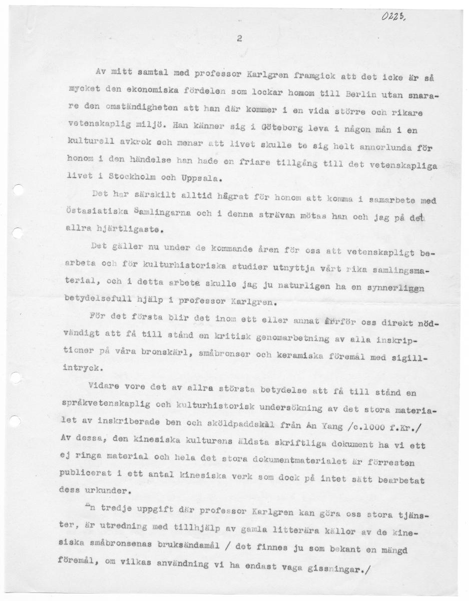 0225, Av mitt samtal med professor Karlgren framgick att ät icke är så mycket äen ekonomiska fördelen som lockar homom till Berlin utan snara- re den omständigheten att han där kommer i en vida större och rikare vetenskaplig miljö. Han känner sig i Göteborg leva i någon mån i en kulturell avkreok each menar att livet skulle te sig helt annorlunda för honom i den händelse han hade en friare tillgång till det vetenskapliga livet i Stockholm och Uppsala. Det har särskilt alltid hågret för honom att komma i samarbete med Östasiatiska Samlingarna och i denna strävan mötas han och jag på det allra hjärtligaste, Det gäller nu under de kommande åren för Oss att vetenskapligt be- arbeta och för kulturhistoriska studier utnyttja vårt rika samlingsma- terial, och i detta arbaté skulle jag ju naturiigen ha en synnerligen betydelsefull hjälp i professor Karlgren. För det första blir det inom ett öllap annat äörför oss direkt nöd- vändigt att få till stånd en kpitisk genomarbetning av alla inskrip- tioner på våra bronskärl, småbronser och keramiska föremål med sigill- intryck. Videre vore det av allra största betydelse att få till stånd en språkvetenskaplig och kulturhistorisk undersökning av det stora materia. let av inskriberade ben och sköldpaddskal från An Yang /e.1000 LaKva/ Av dessa, den kinesiska kulturens älästa skriftliga dokument ha vi ett ej ringa material och hela ået stora dokumentmaterialet är förresten publicerat 1 ett antal kinesiska verk som dock på intet sätt bearbetat dess urkunder, ”n tredje uppgift där professor Karlgren kan göra oss stora tjäns. ter, är utredning med tillhjälp av gamla litterära källor av de kine- siska småbronsenas bruksändamål / det finnes ju som bekant en mängd föremål, om vilkas användning vi ha endast vaga gilssningar,/