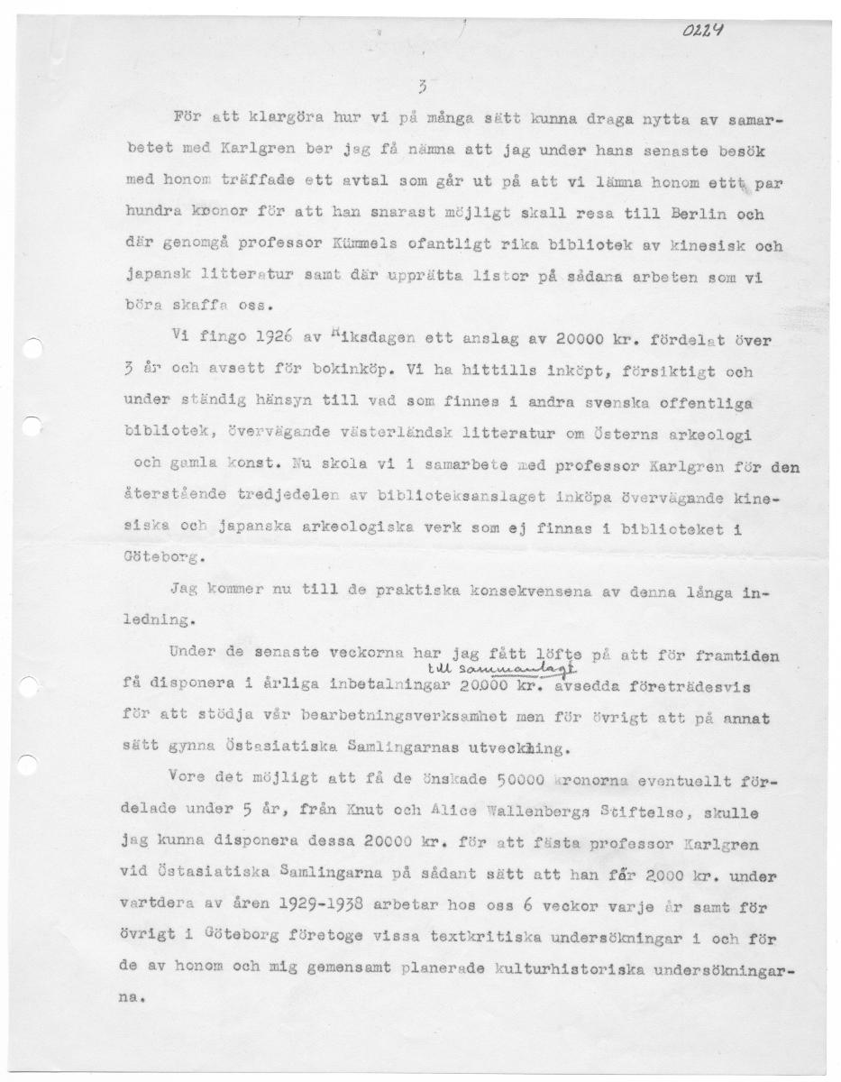 ; / OMG För att klergöra hur vi på många sätt kunna draga nytta av samar- betet med Karlgren ber jsg få nämna att jag under hans senaste besök med honom träffade ett avtal som går ut på att vi lämna honom etit par hundra kponor för att han snarast möjligt skall resa till Berlin och där genomgå professor Kuämmels ofantligt rika bibliotek av kinesisk och japansk litteratur samt där upprätta listor på sådara arbeten som vi böra skaffa 0885. Vi fingo 1926 av "iksdagen ett anslag av 20000 kr. fördelat över 3 år och avsett för bokinköp. Vi ha hittills inköpt, försiktigt och under ständig hänsyn till vad som finnes i andra svenska offentliga bibliotek, övervägande västerländsk litteratur om Österns arkeologi och gamla konst. Nu skola vi i samarbete med professor Karlgren för den återstående tredjedelen av biblioteksanslaget inköpa övervägande kine- siska och japanska arkeologiska verk som ej finnas i biblioteket i Göteborg. Jag kommer nu till de praktiska konsekvensena av denna långa in- ledning. Under de senaste veckorna har jag fått löfte på att för framtiden LU SOMAMA Ceten | få disponera i årliga inbetalningar 20000 kr. avsedda företrädesvis för att stödja vår bearbetningsverksamhet men för övrigt att på annat sätt gynna Östasiatiska Samlingarnas utveckhing. Vore det möjligt att få de önskade 50000 kronorna eventuellt för- delade under 5 år, från Xnut och Alice Wallenbergs Stiftelse, skulle jag kunna disponera dessa 20000 kr, för att fästa professor Karlgren vid Östasiatiska Samlingarna på sådant sätt att han får 2000 kr. under vartdera av åren 1929-1938 arbetar hos oss 6 veckor varje år samt för övrigt i Göteborg företoge vissa textkritiska undersökningar 1i och för de av honom och mig gemensamt planerade kulturhistoriska undersökningar- nä,