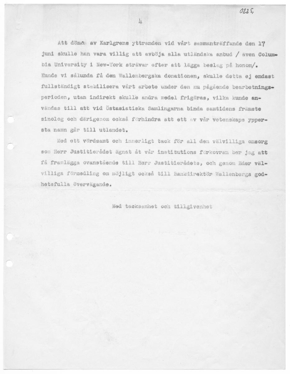 nn TTT FORRPNAAR ATT ARYPPYENN EDET TREE IAYAE YTTER EX er vererun fs an snebä gy 0 = av IPS re sr i rinna OZ25, Att åömar av Karlgrens yttranden vid vårt senmmanträffande den 17 juni skulle hen vara villig att avböja alla utländska anbud / även Colums bla University 1 New-York strävar ofter att lägga beslag på honom/. Kunde vi sålunda få den Veallenbergska donationen, skulle detta od endast fullständigt stabilisera vårt arbete under den nu pågående bearbetnings= perloden, utan lndirekt skulle andra medel frigöras, vilka kunde an vändas till att vid Östasiatiska Samlingarna binda samtldens främste sinolog och därigenom också förhindra att ett v vår votenskaps ypper- sta namn går till utlandet, ed ett vöråsamt och innerligt tack för all den välvilliga omsorg som Herr Justitierådet ägnat åt vår institutions förkovran ber jag att få framlägga ovanstående till Herr Justitlerådets, och genom Eder väl- villiga förmedling om mölligt också tilll Hankdirektör Wallenberga god. hötsfulla övervägande. ked taecksarhet och tiligivenhet