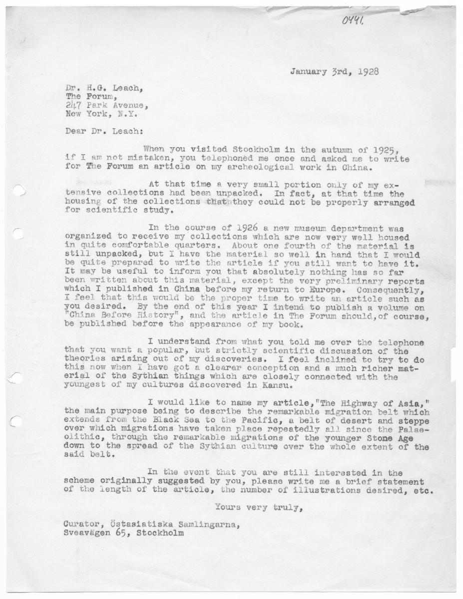 FR NER TAGER FR a s/ Eg 5 nd < a OM January 3rd, 1928 Dr. H.G. Leach, The Forum, 2117 Park Avenue, New York, N.Y. Dear Dr. Leach: When you visited Stockholm in the autum of 1925, if I am not mistaken, you telephoned me once and asked me to write for The Forum en article on my ercheologicel work in China. At that time a very small portion only of my ex- tensive collections had been unpacked. In fec...