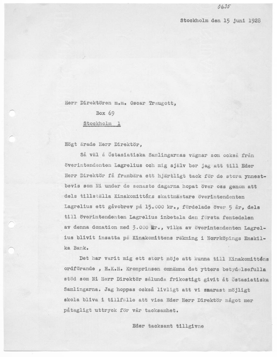 0635 Stockholm den 15 juni 1928 Herr Direktören m.m, Oscar Traugott, Box 69 Stockholm I Högt ärade Herr Direktör, Så väl å Östasiatiska Samlingarnas vägnar som också från överintendenten Lagrelius och mig själv ber jag att till Eder Herr Direktör få framböära ett hjärtligt tack för de stora ynnest: bevis som Ni under de senaste dagarna hopat över oss genom att dels tillställa Kinakomittérs skattmä...
