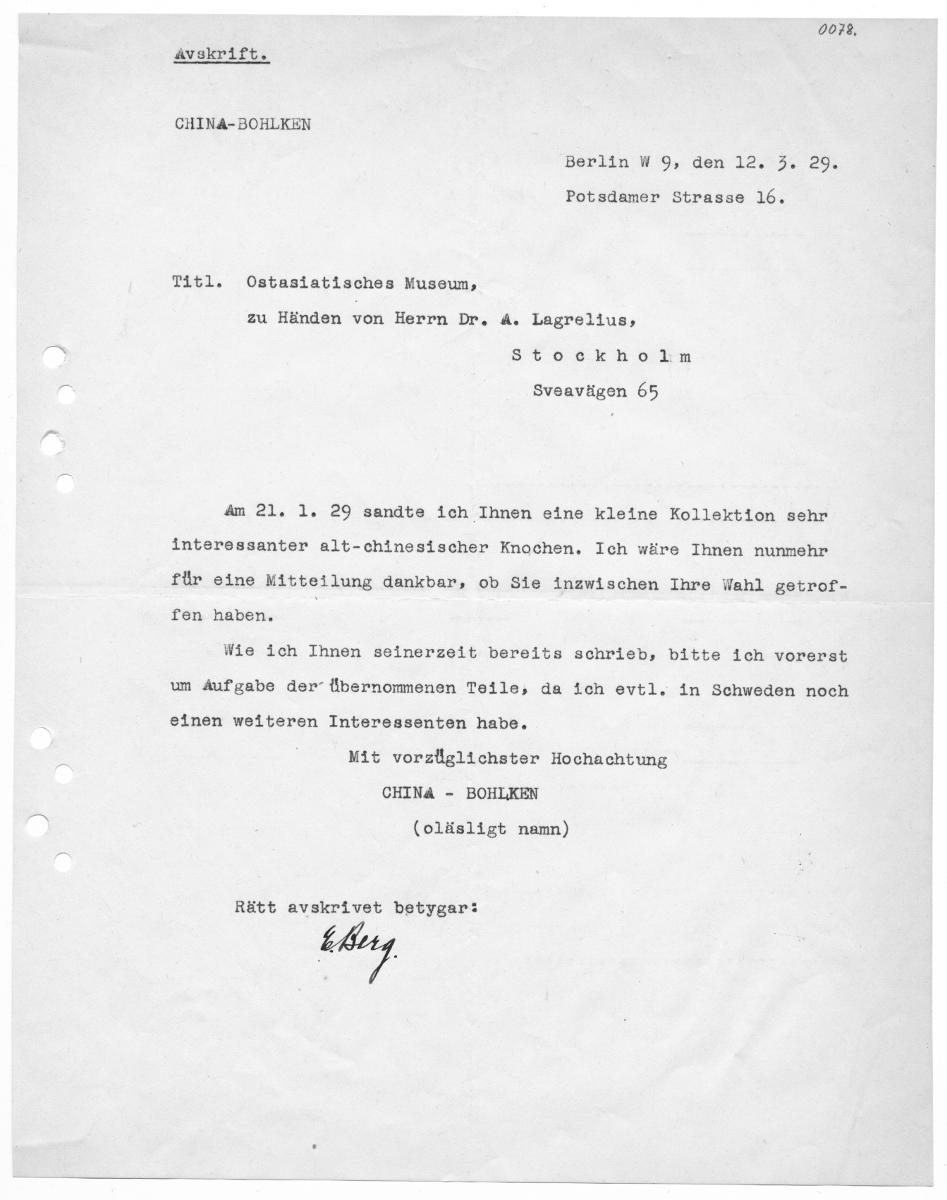 0073, Avskrift. CHINA-BOHLKEN Berlin W-9> den 12: 3; 29: Potsdamer Strasse 16. Titl. Ostasiatisches Museum; zu Händen von Herrn Dr, A. Lagrelius, för STO CKkh oi - Sveavägen 65 Am 21. 1. 29 sandte ich...