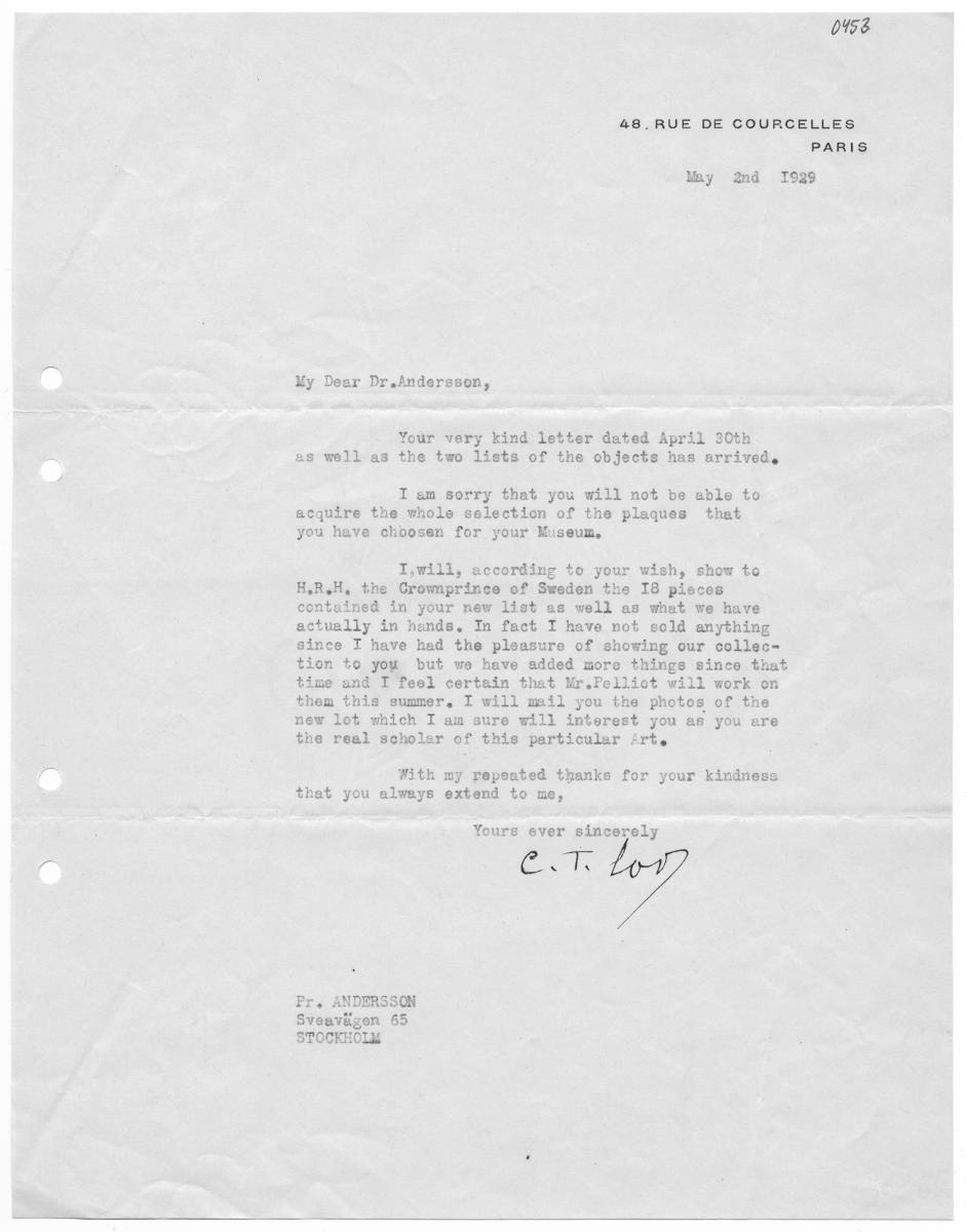 0158 48 RUE DE COURCELLES PARIS May 2nd 1989 My Dear Dr.Andersson, Your very kind letter dated April 30th as well as the two lists of the objects has arrived, I am sorry that you will not be able to acquire the whole selection of the plaques that you have chbosen for your Museum, I,will, according to your wish, show to H.R.H, the Crownprince of Sweden the 18 pieces contained in your new list as we...